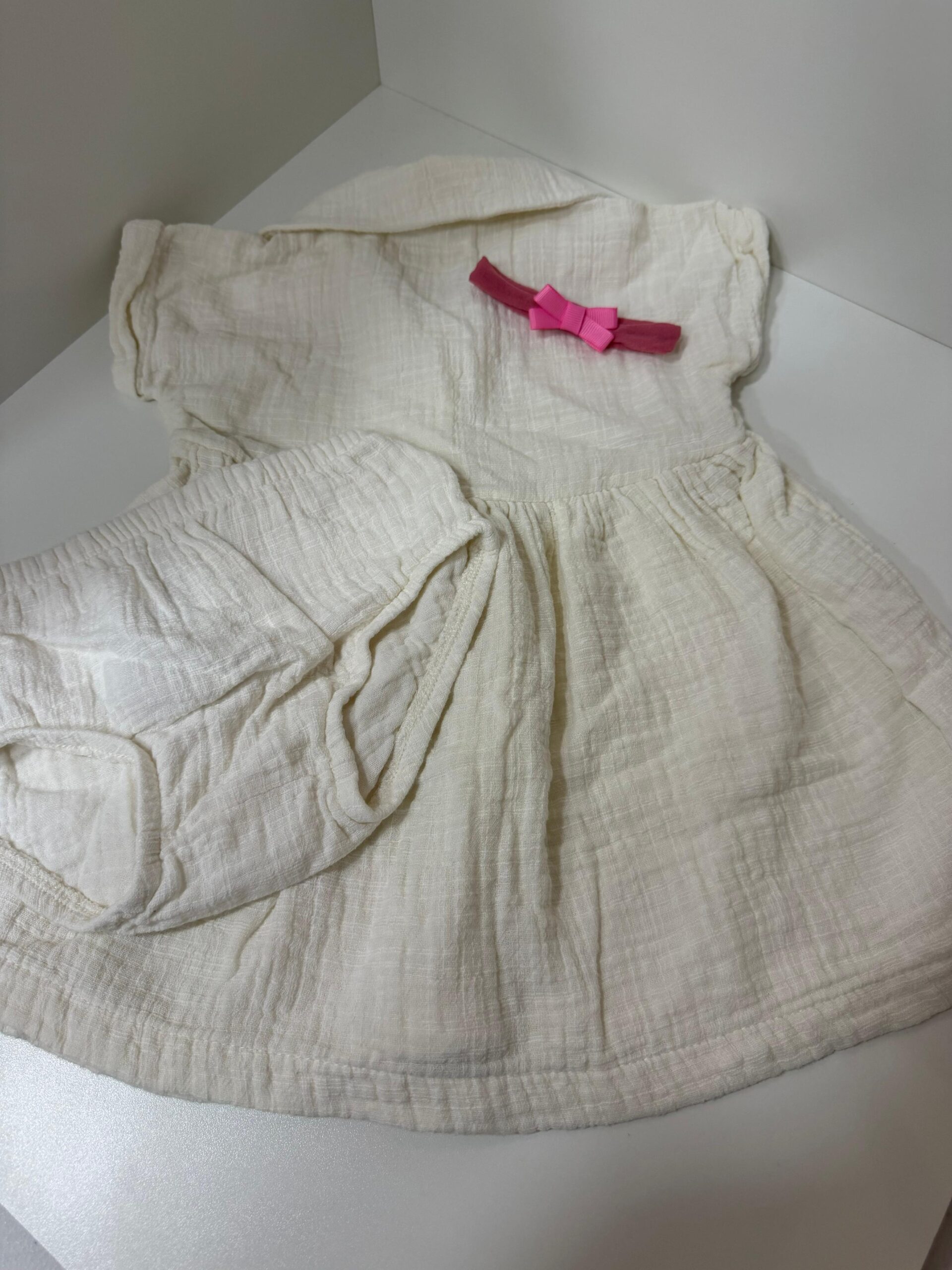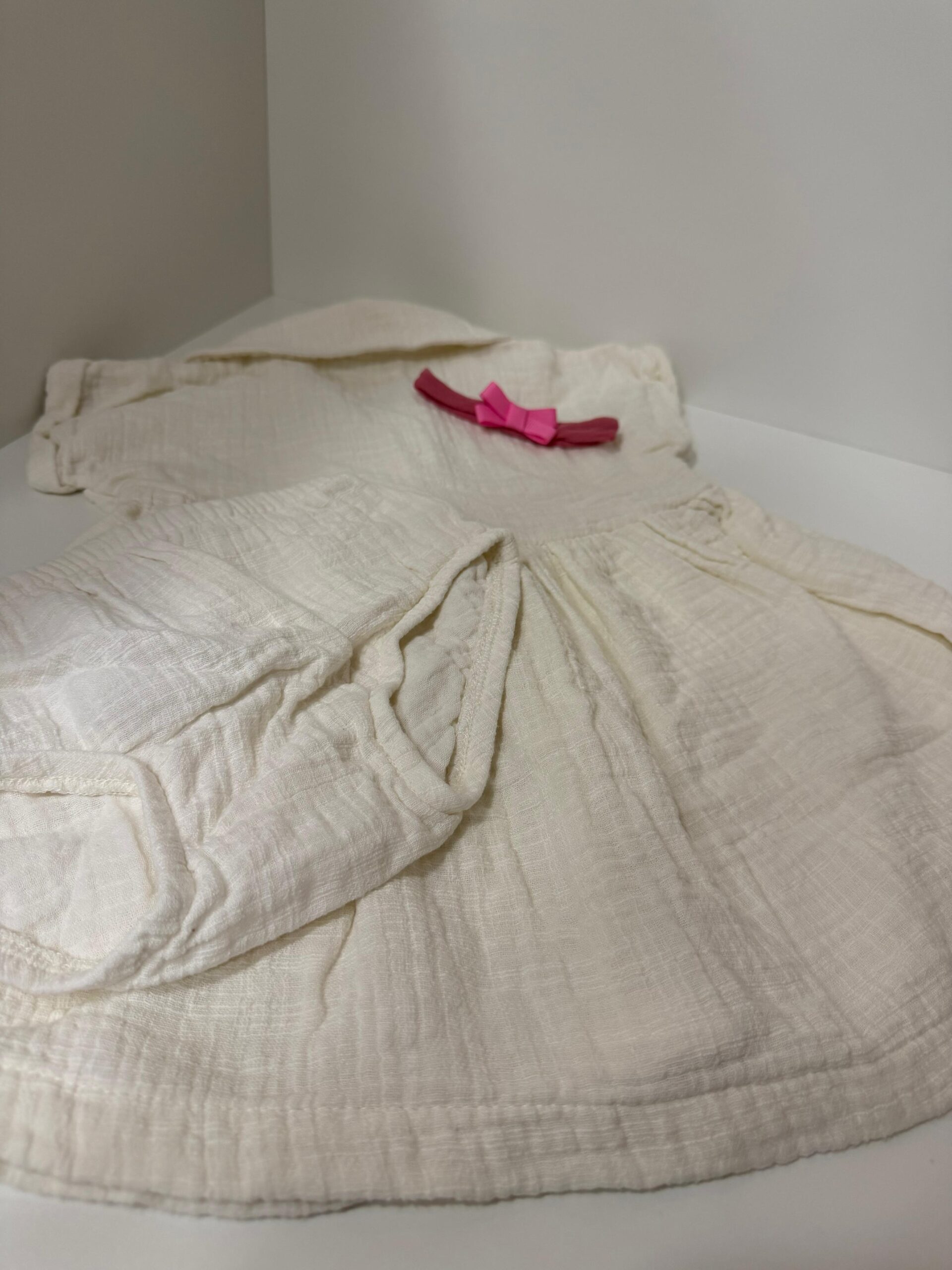 Um vestido delicado em gaze de algodão off-white, leve e macio, perfeito para manter o bebê fresquinho e confortável nos dias mais quentes.