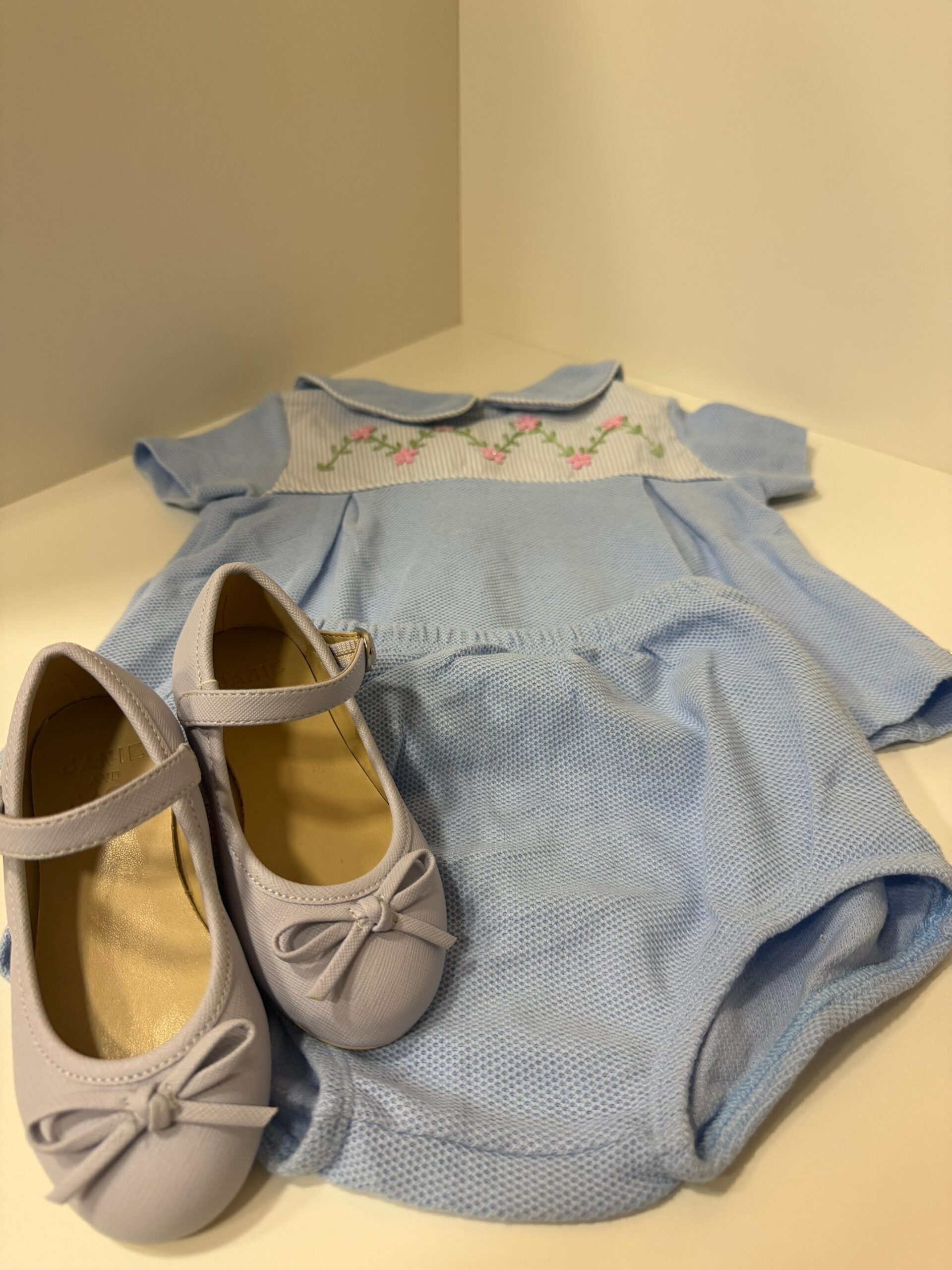 Um conjunto encantador em tom azul suave, com blusinha de manga curta e gola arredondada que traz um ar clássico e atemporal.