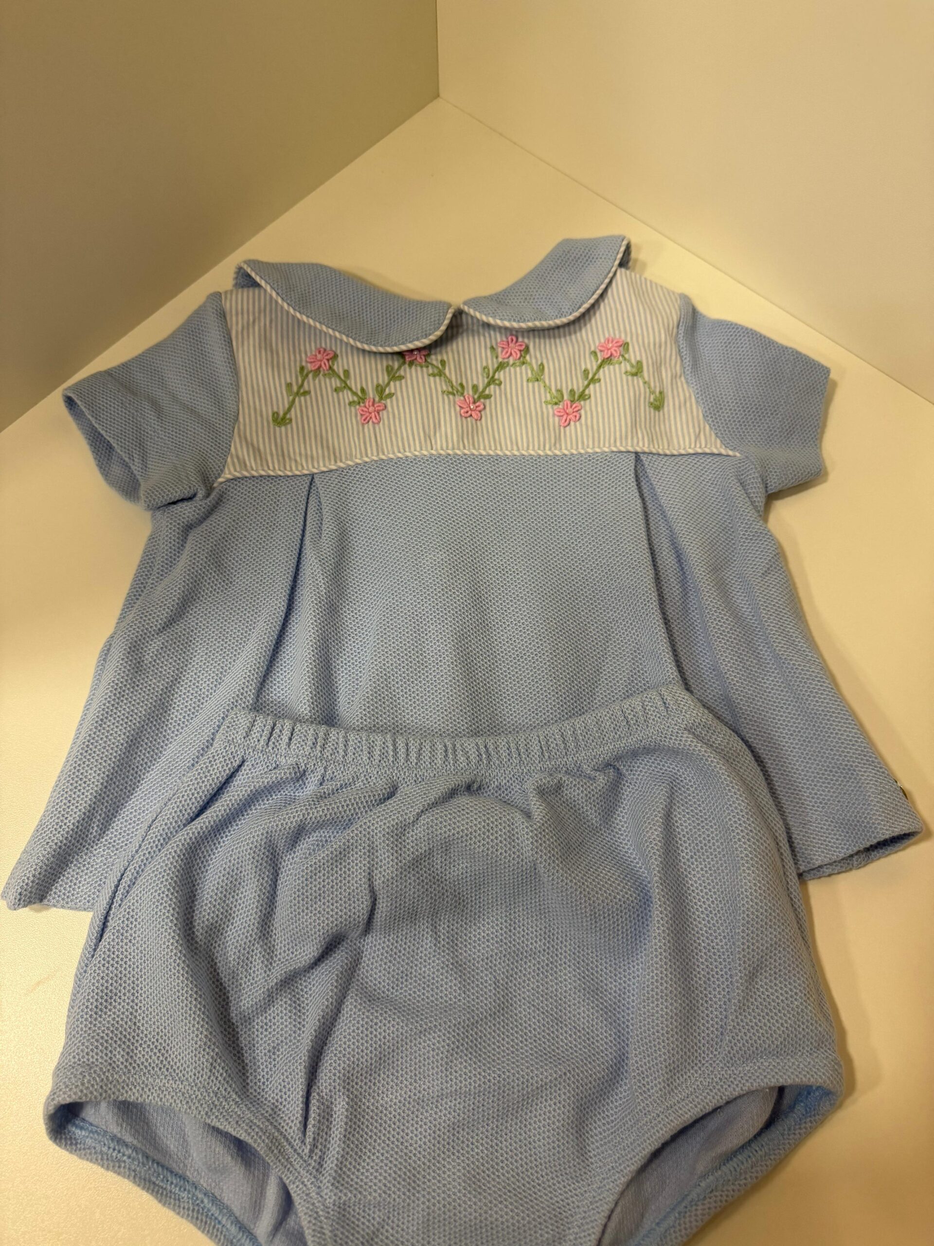 Conjunto Azul com Bordado Floral e Tapa Fralda