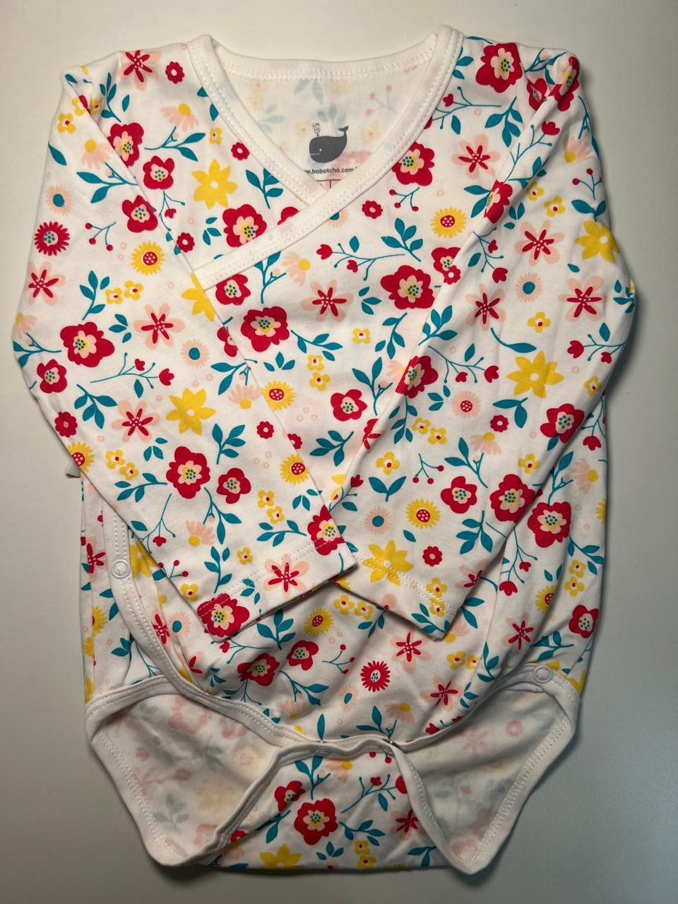 Body delicado e super confortável, com manga longa e estampa floral colorida em fundo branco, cheio de detalhes encantadores.