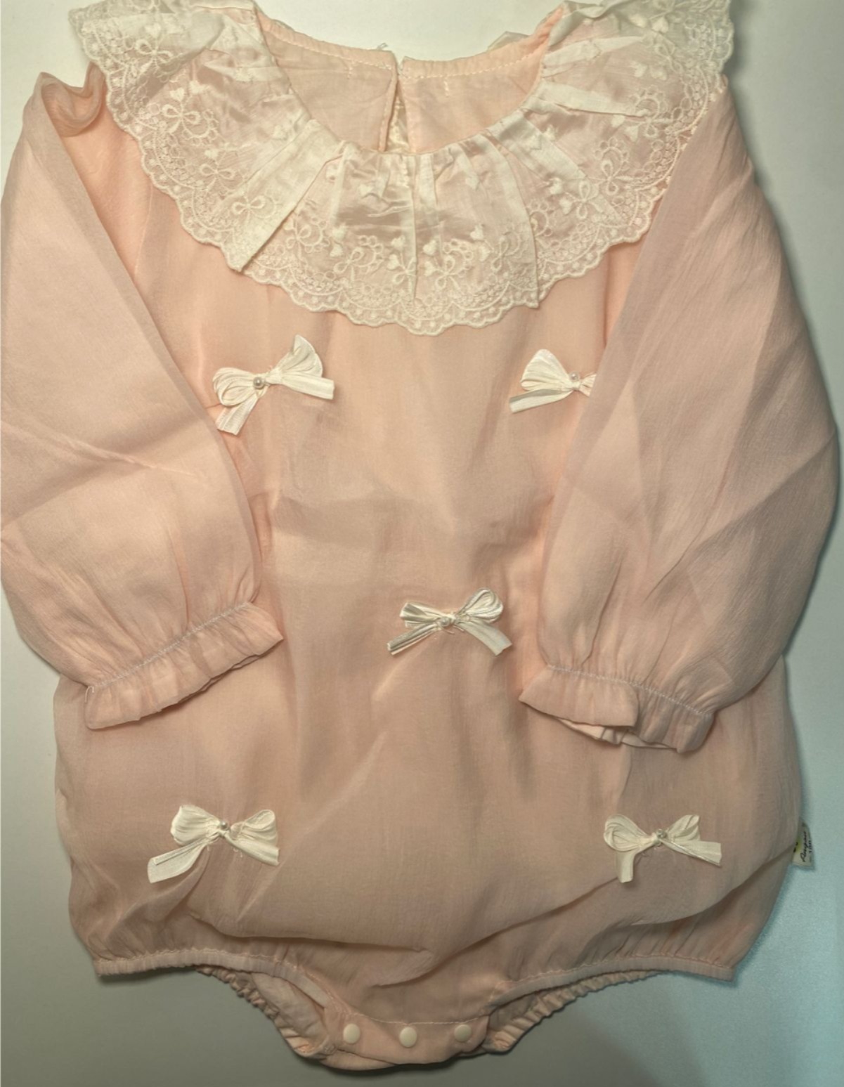 Possui gola ampla com renda, mangas longas com elástico suave e aplicação de pequenos laços com pérolas, trazendo um toque clássico e sofisticado.