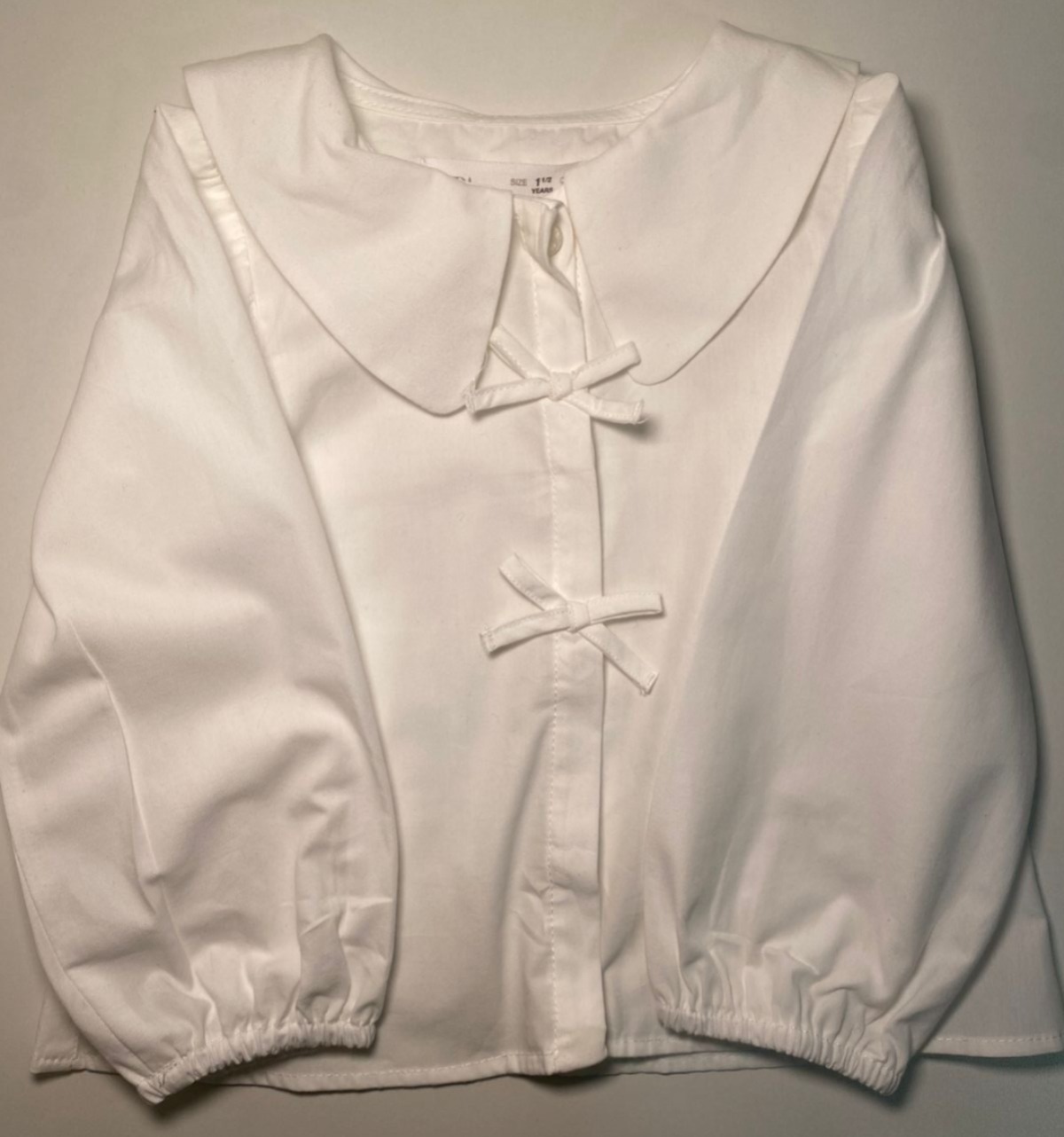 O destaque fica por conta dos laços frontais e das mangas levemente bufantes, que trazem um toque clássico e feminino.