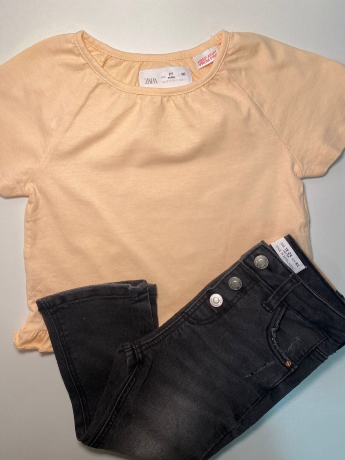 Composto por blusa em tom neutro, delicada e fácil de combinar, junto com calça preta estilo jeans com botões, que traz um toque mais estiloso ao visual.