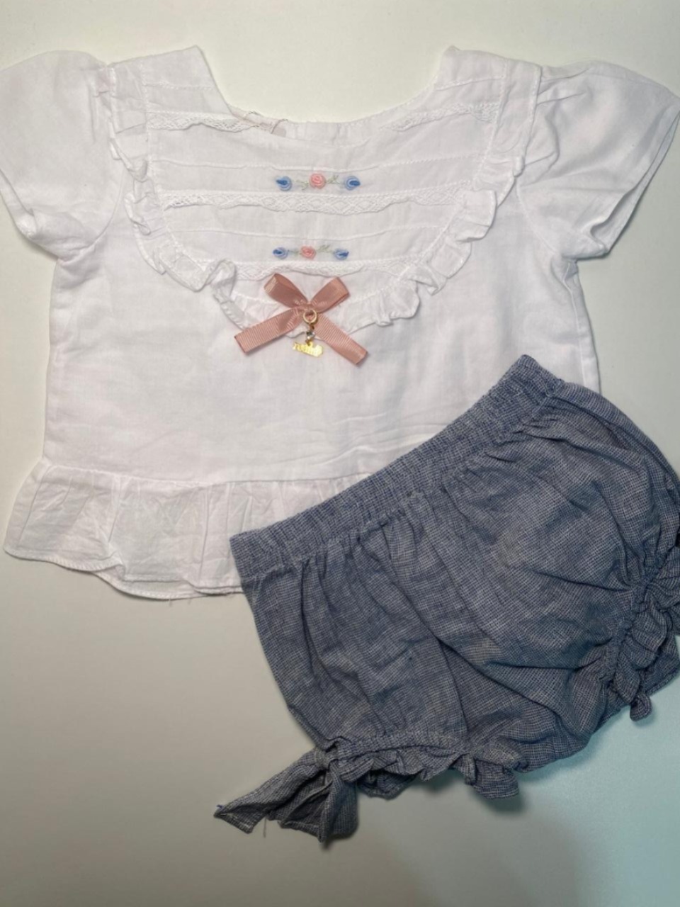 Acompanha short em tecido texturizado azul, com elástico confortável e amarração lateral, garantindo charme e praticidade. Perfeito para ocasiões especiais ou para um dia lindo e estiloso.
