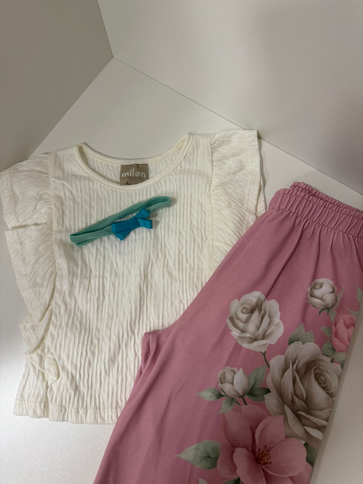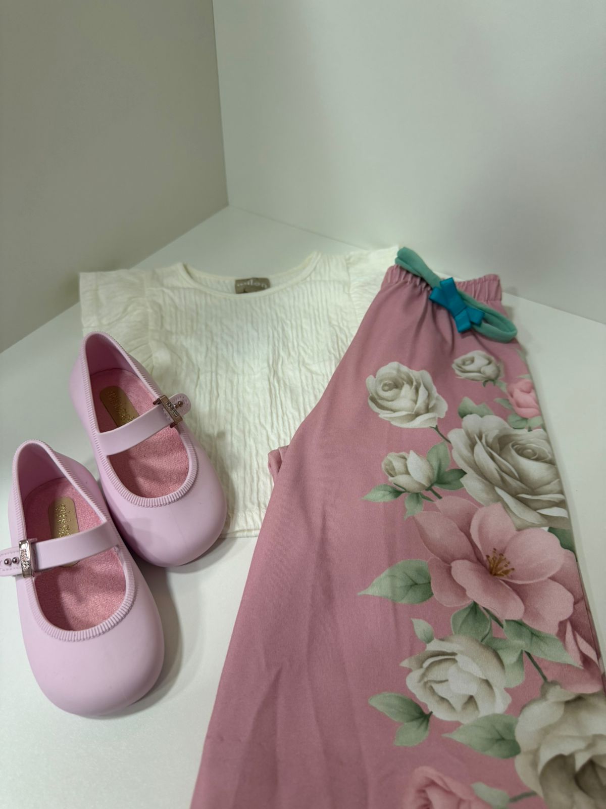 Conjunto delicado composto por blusinha off-white com textura suave e manguinhas levemente franzidas, combinada com calça em tom rosé com estampa floral elegante em tamanho maior, trazendo sofisticação ao look.