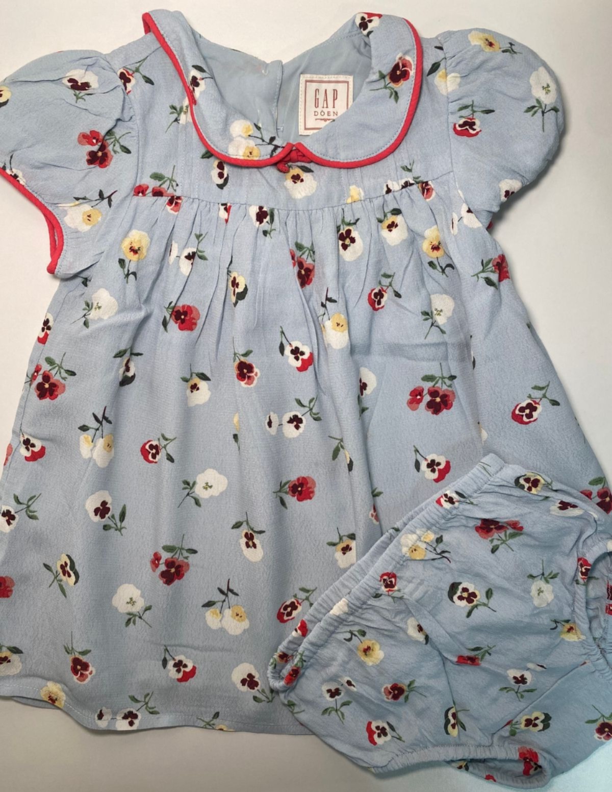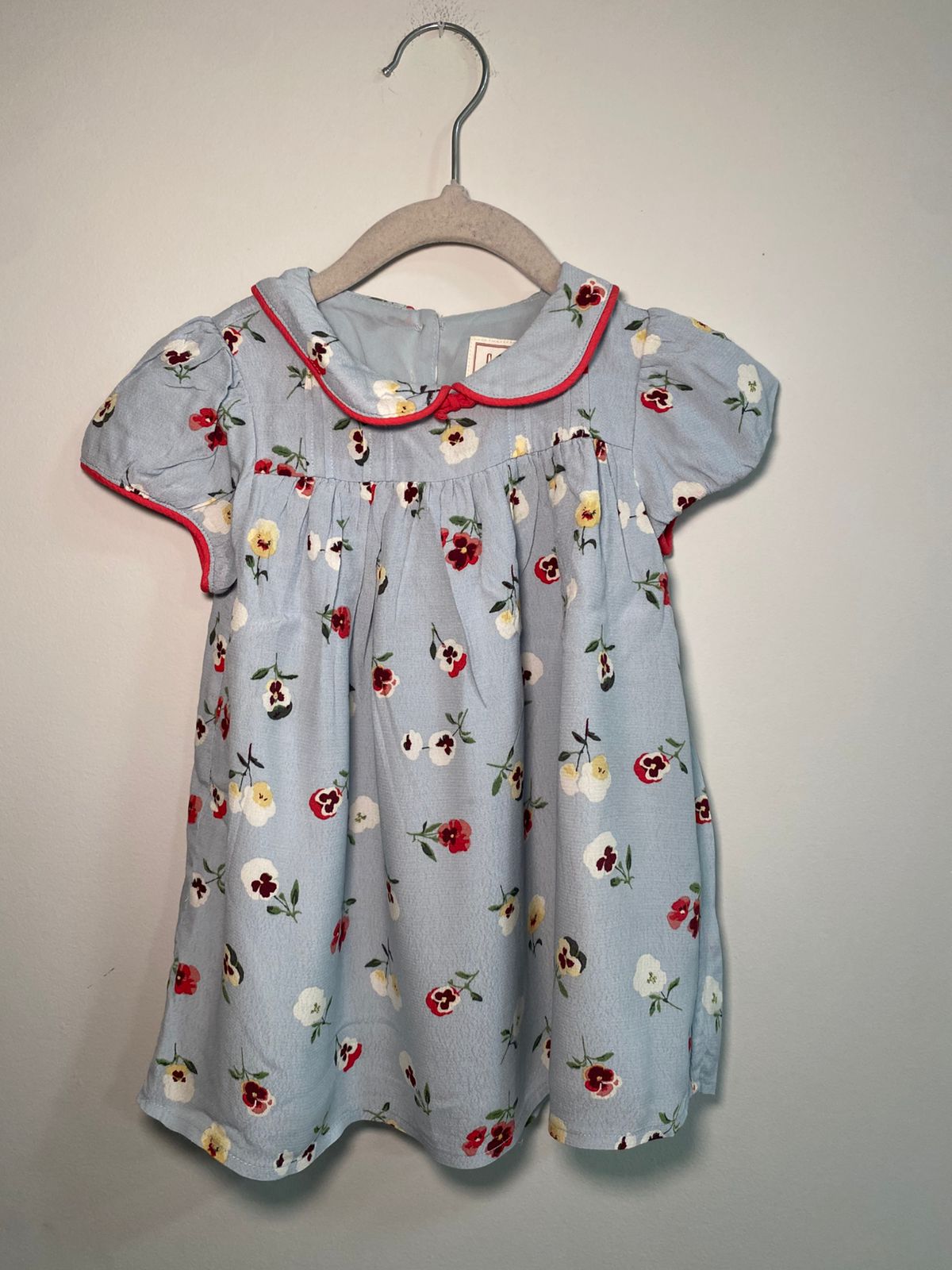 Conjunto infantil delicado composto por vestido em tom azul claro com estampa floral charmosa em tons de vermelho, branco e amarelo.