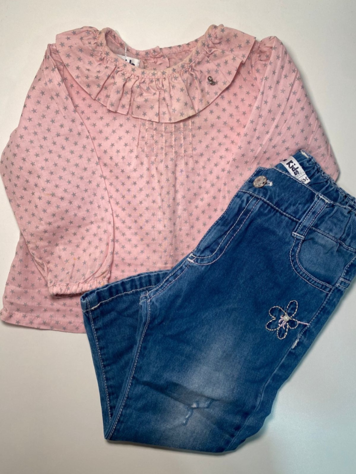 Conjunto delicado e cheio de charme, composto por blusinha rosa com estampa de estrelinhas e gola com babados, trazendo um toque romântico e fofo.