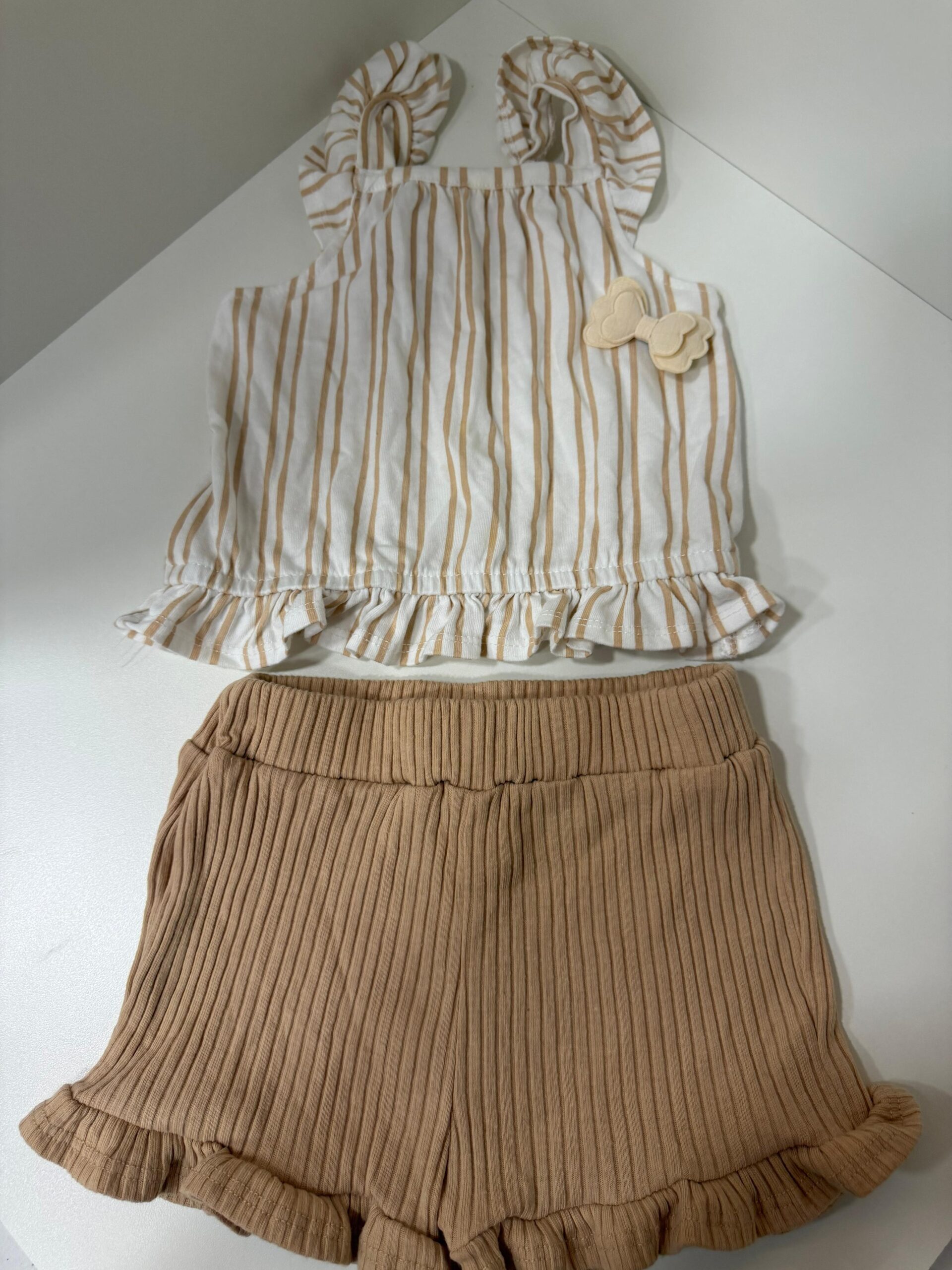 Conjunto infantil super delicado e confortável, perfeito para compor looks charmosos e fresquinhos nos dias mais quentes. A blusinha em tecido leve traz listras em tom caramelo sobre fundo off-white, com alcinhas de babado e aplicação de lacinho, criando um visual doce e elegante. O short em malha canelada caramelo possui cós elástico e acabamento com babadinhos na barra, garantindo ajuste confortável e liberdade de movimento para a bebê. Uma combinação harmoniosa de cores neutras, ideal para passeios, festinhas ou momentos especiais com muito estilo.