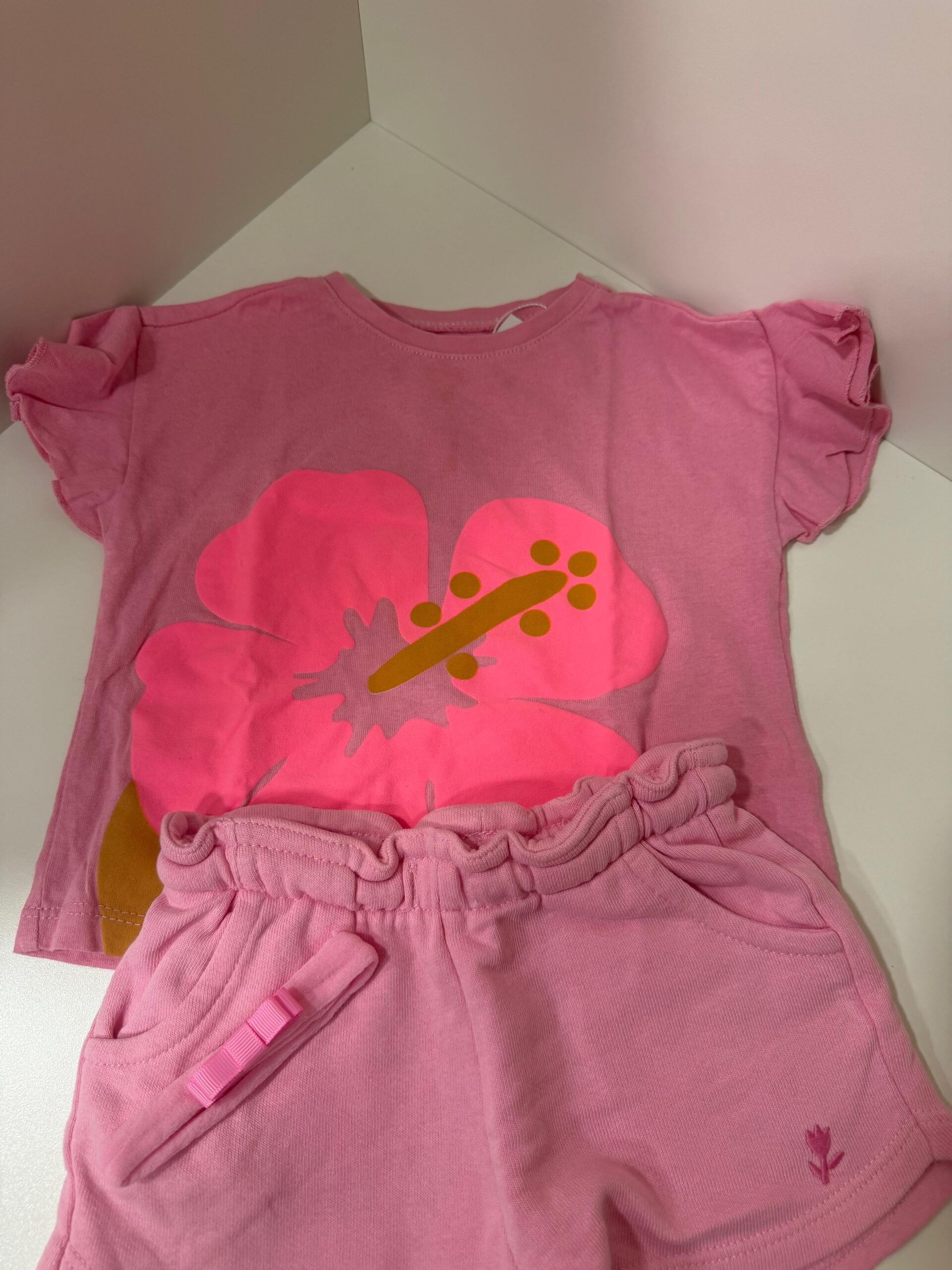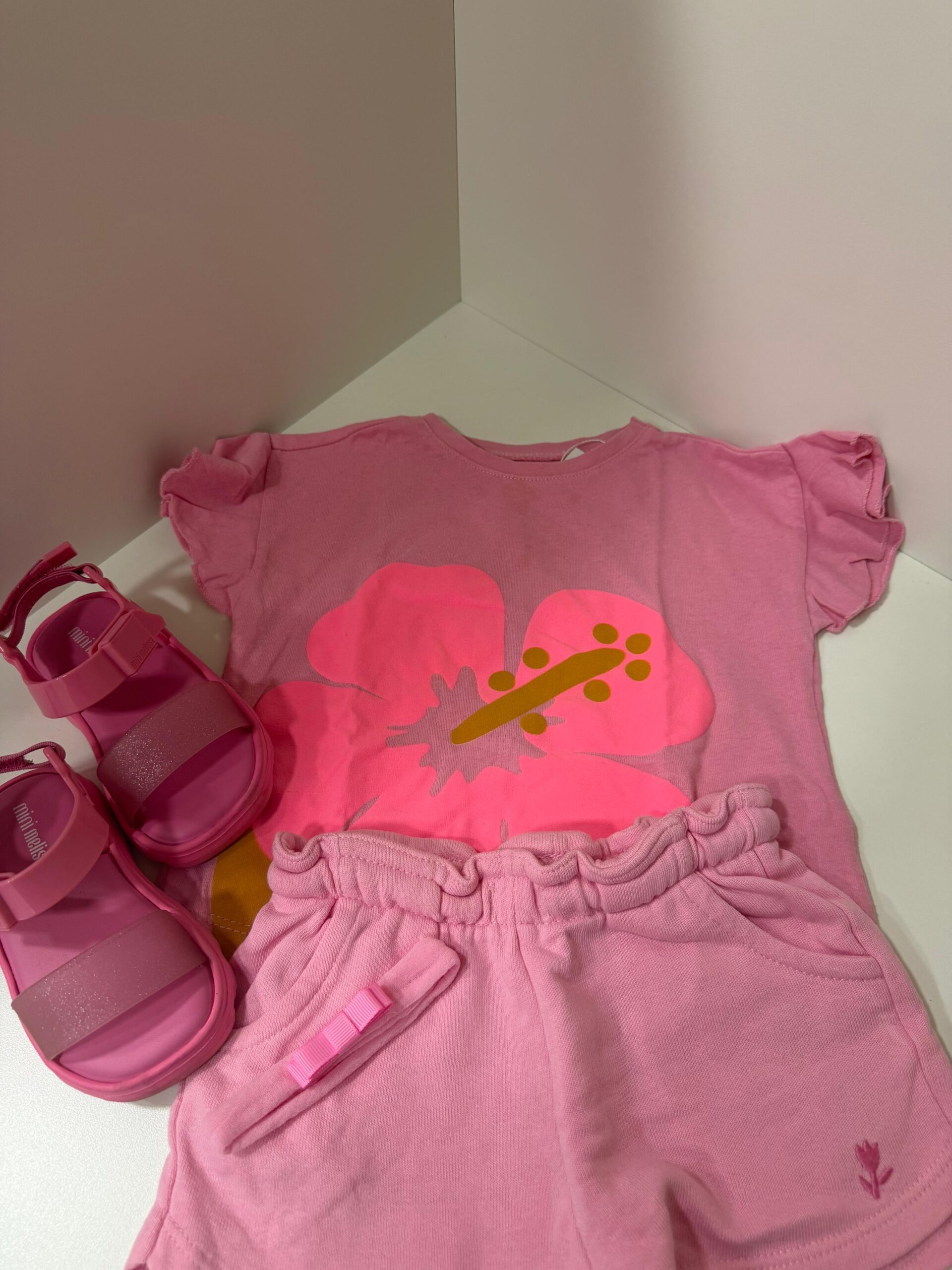 Um look encantador para as pequenas! Conjunto composto por camiseta rosa com estampa vibrante de flor tropical e shorts rosa com cós confortável e detalhe delicado de laço.