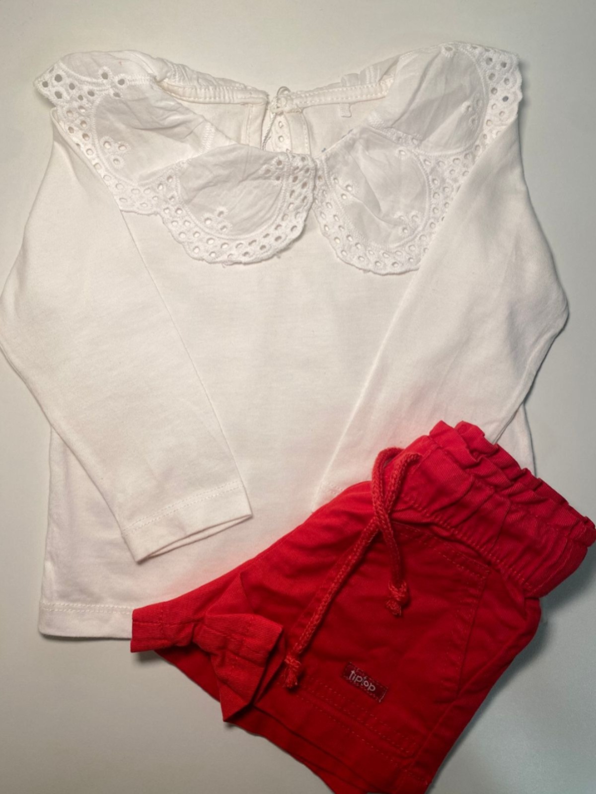 Conjunto encantador e cheio de personalidade, composto por blusinha off white com detalhes delicados em laise na barra, trazendo um toque romântico e leve. Acompanha short vermelho vibrante com elástico e amarração, garantindo conforto e um visual alegre.