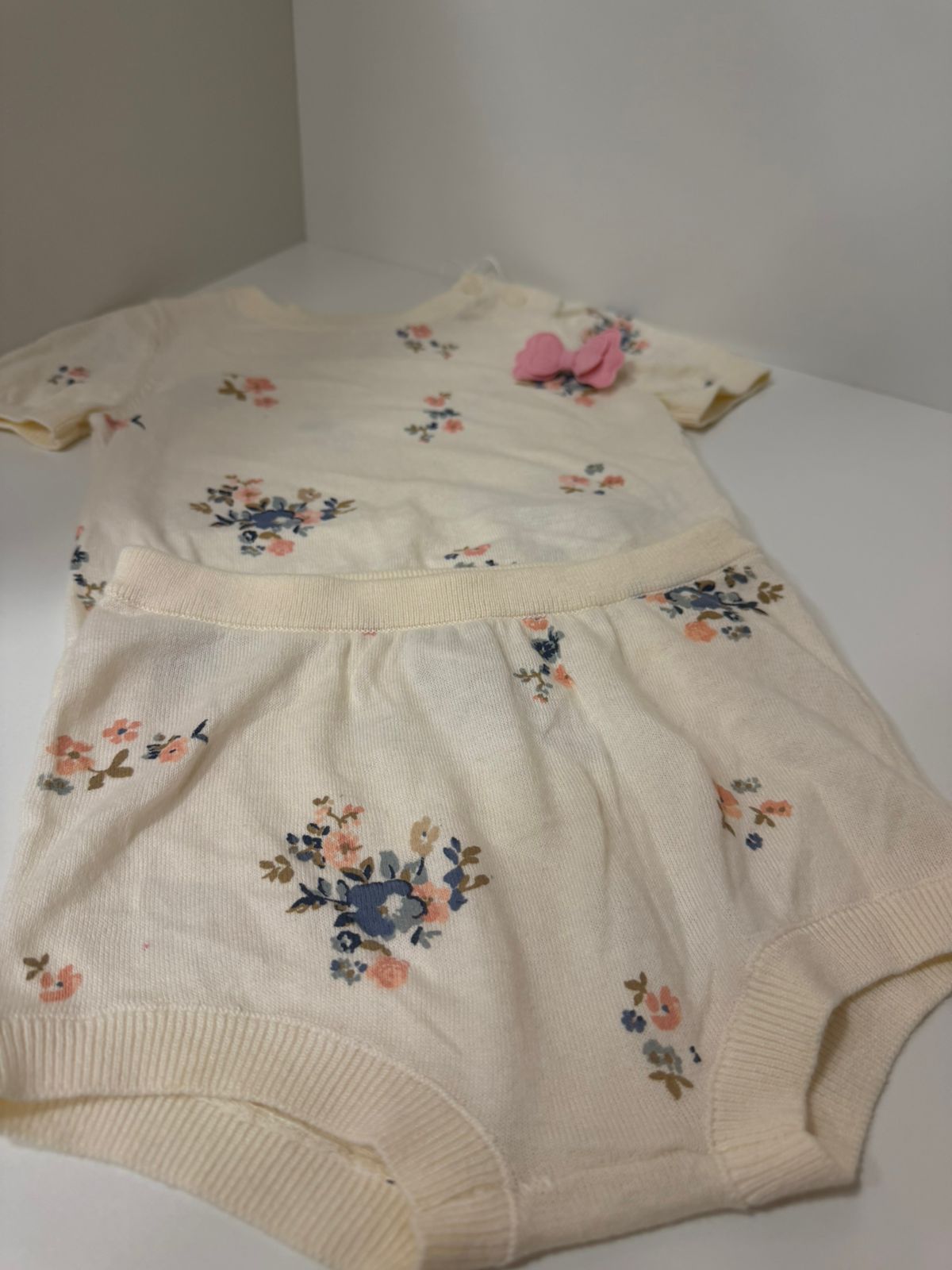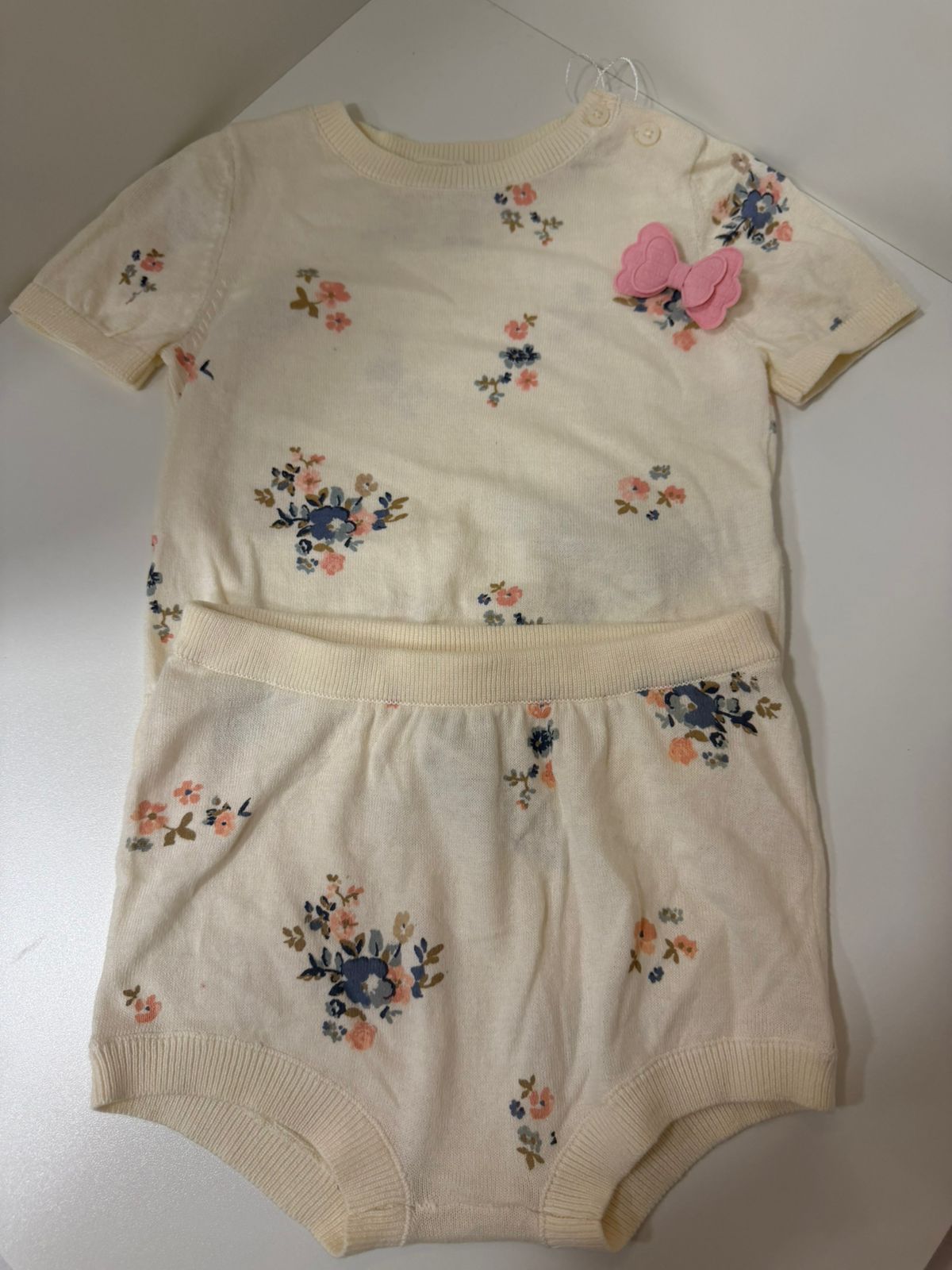 Um conjunto delicado e encantador em tricot off-white, com estampa floral suave em tons pastel que traz leveza e romantismo ao look infantil.