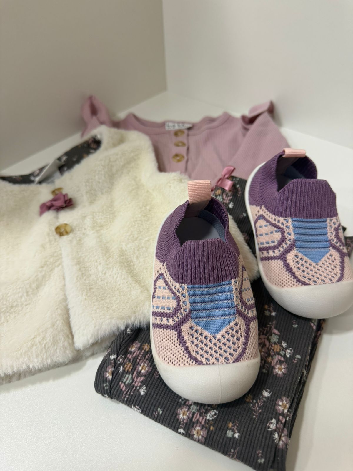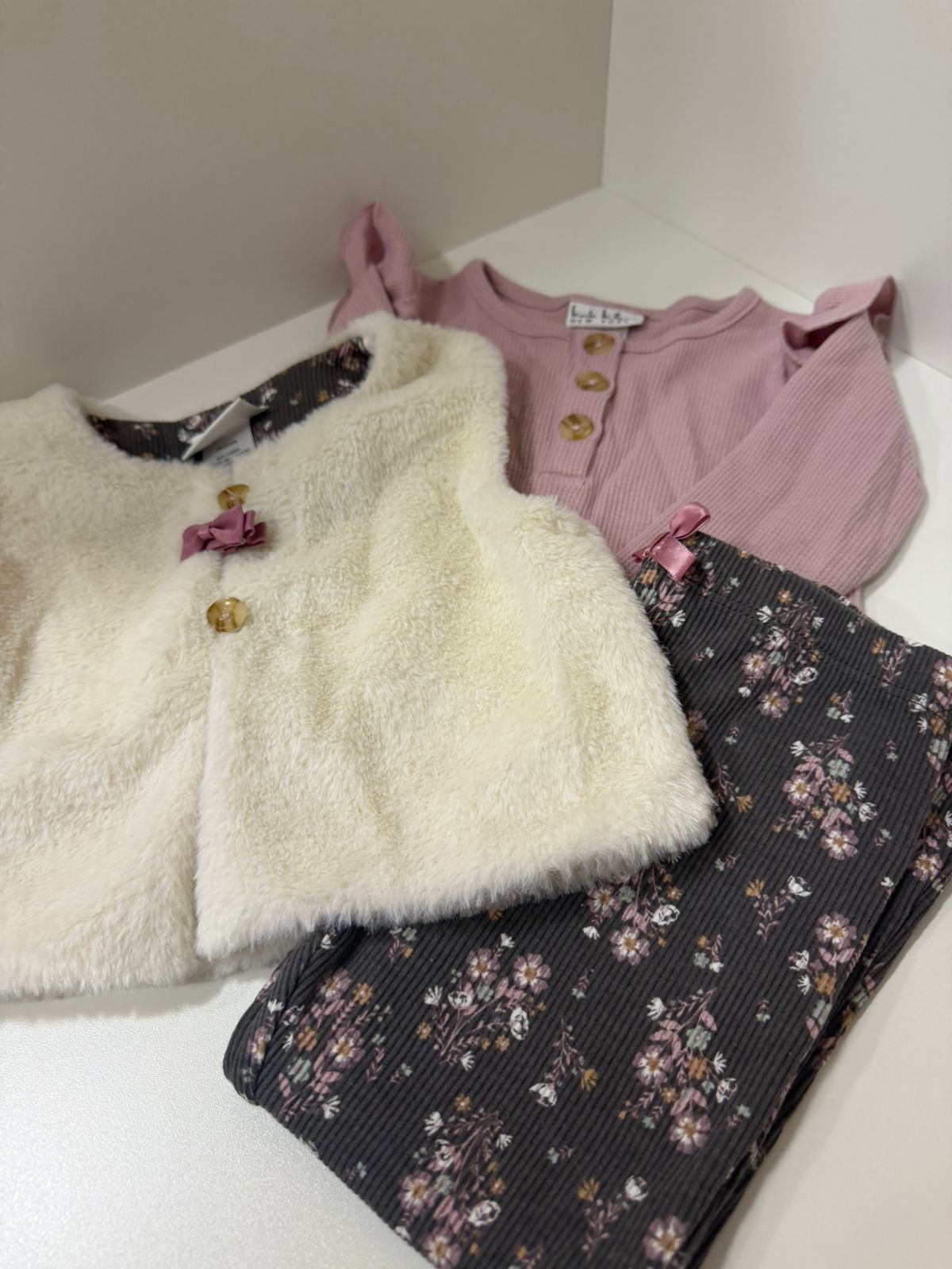 Conjunto delicado e super charmoso composto por blusinha rosa canelada com botões frontais, calça em tecido canelado com estampa floral em tons suaves e colete peluciado off-white que deixa o look ainda mais especial.