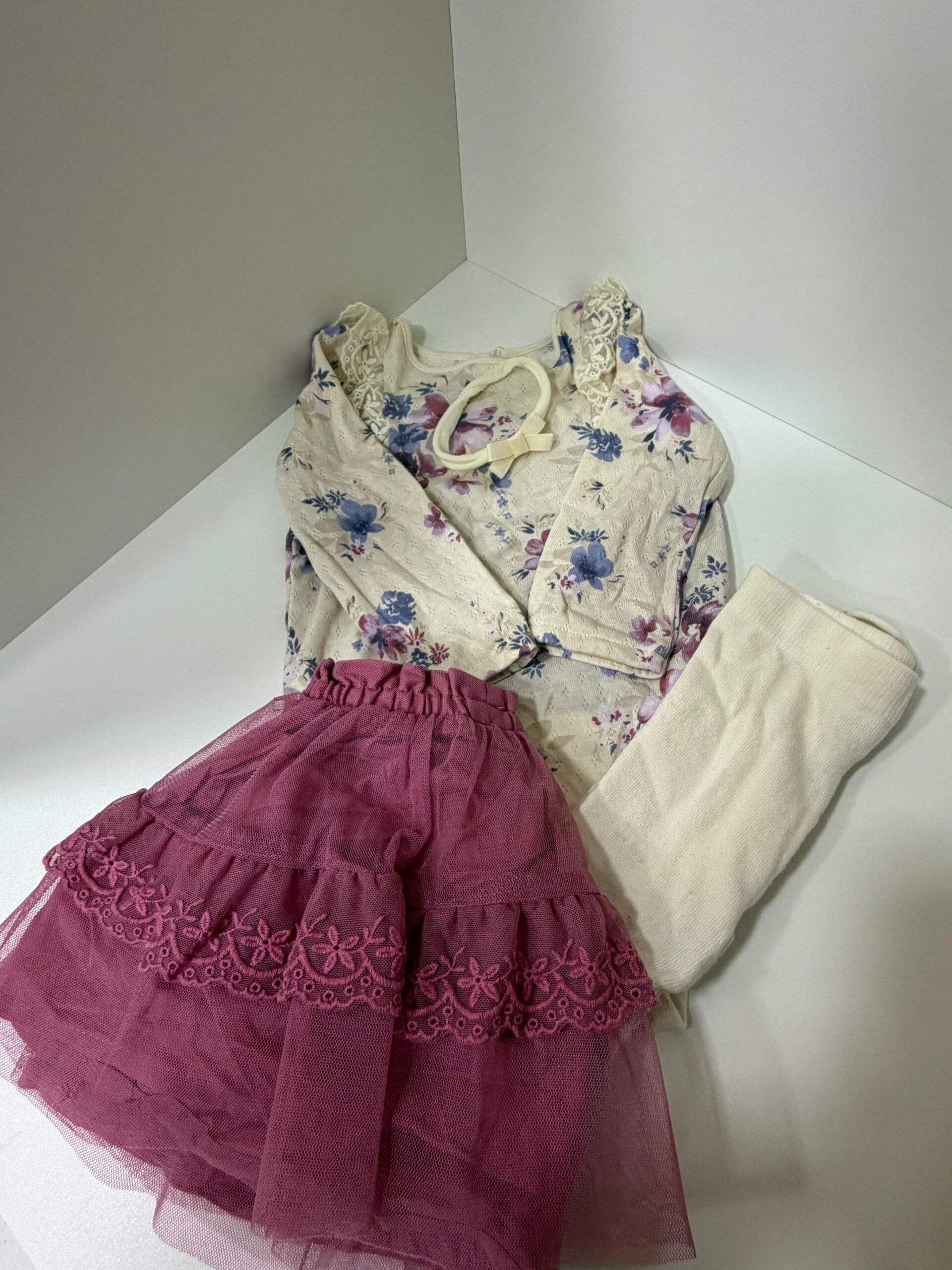 Conjunto super delicado composto por blusinha floral em tom creme com detalhes rendados nos ombros, saia em tule rosé com camadas e acabamento em renda que traz volume e charme ao look, e legging off-white para completar com conforto.