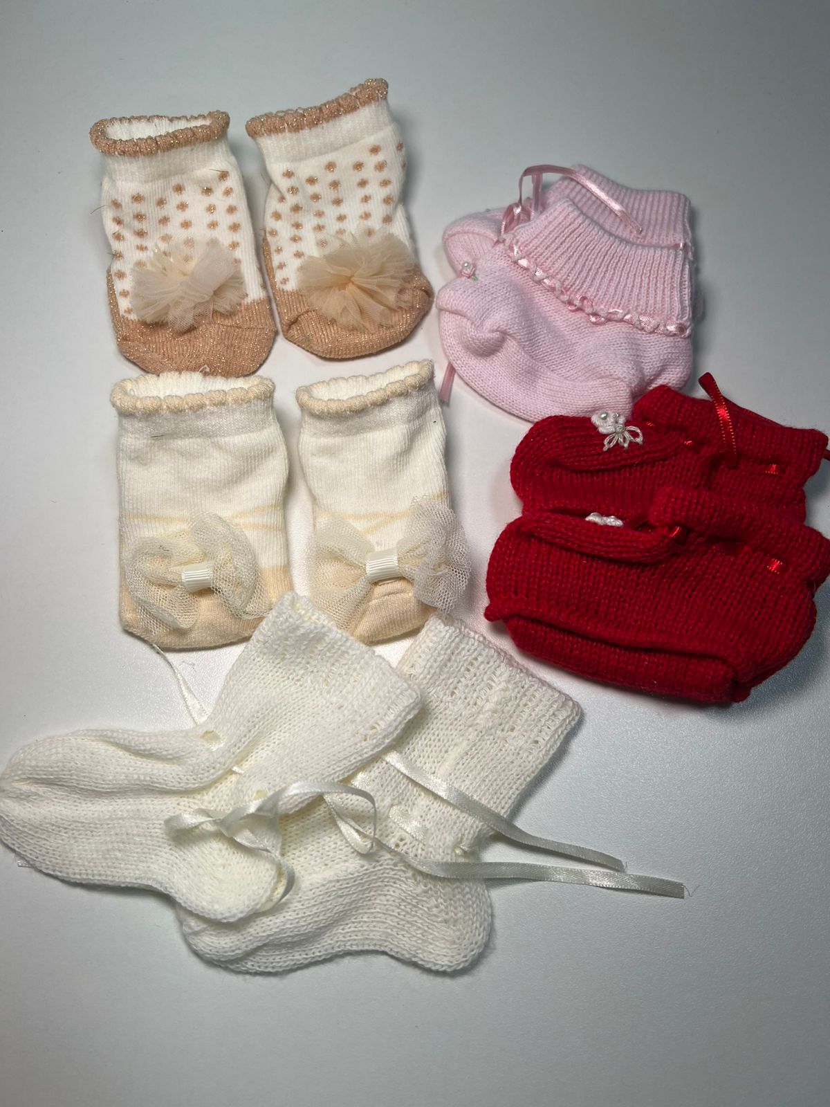 Kit encantador com meias e sapatinhos em tons suaves, com detalhes em laços, texturas e acabamentos delicados.