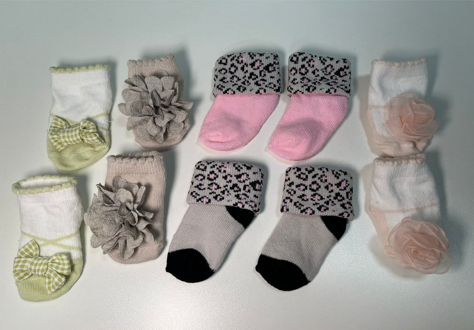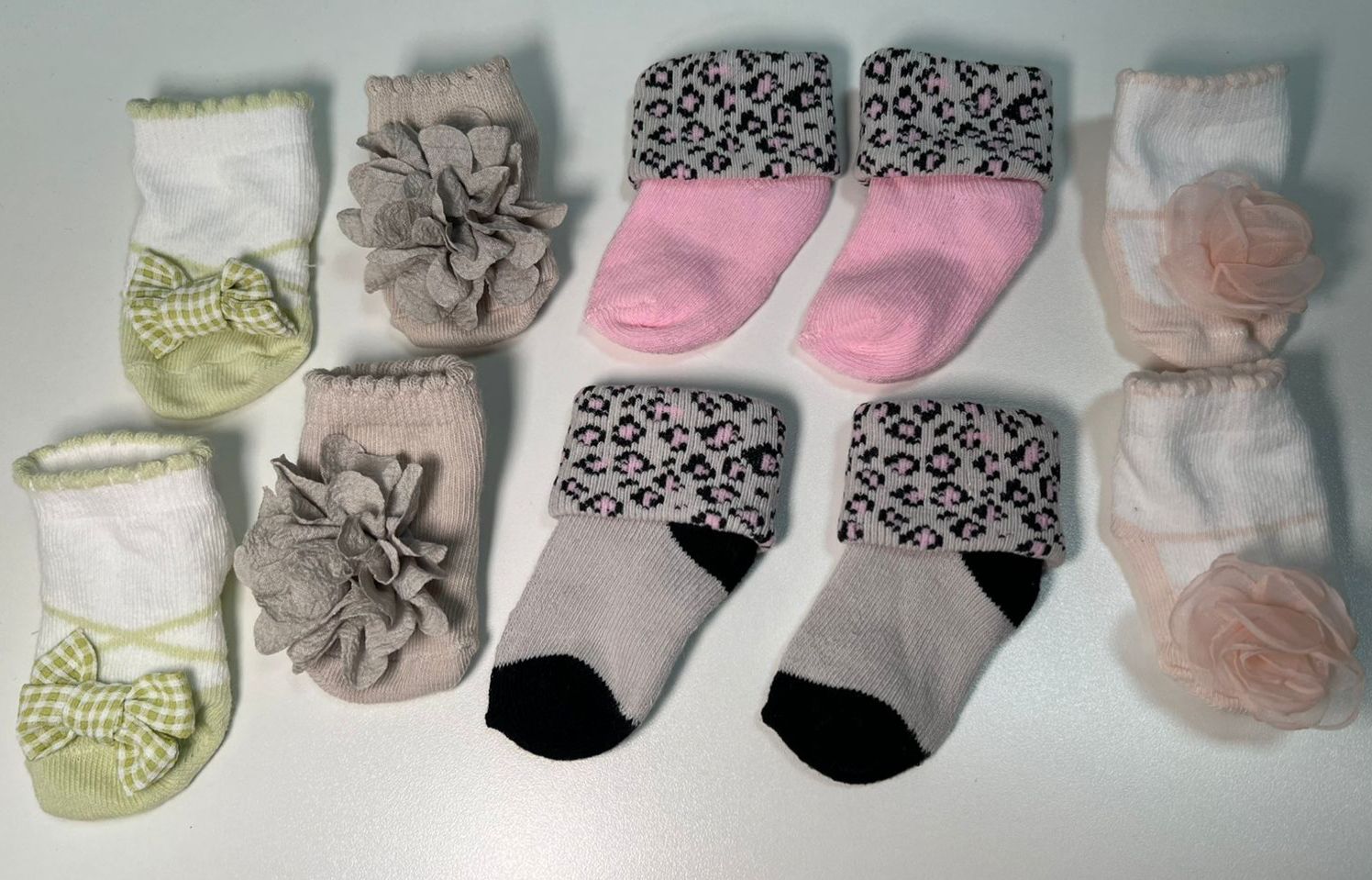 Kit com meias cheias de personalidade, combinando estampas modernas, laços e aplicações florais delicadas.