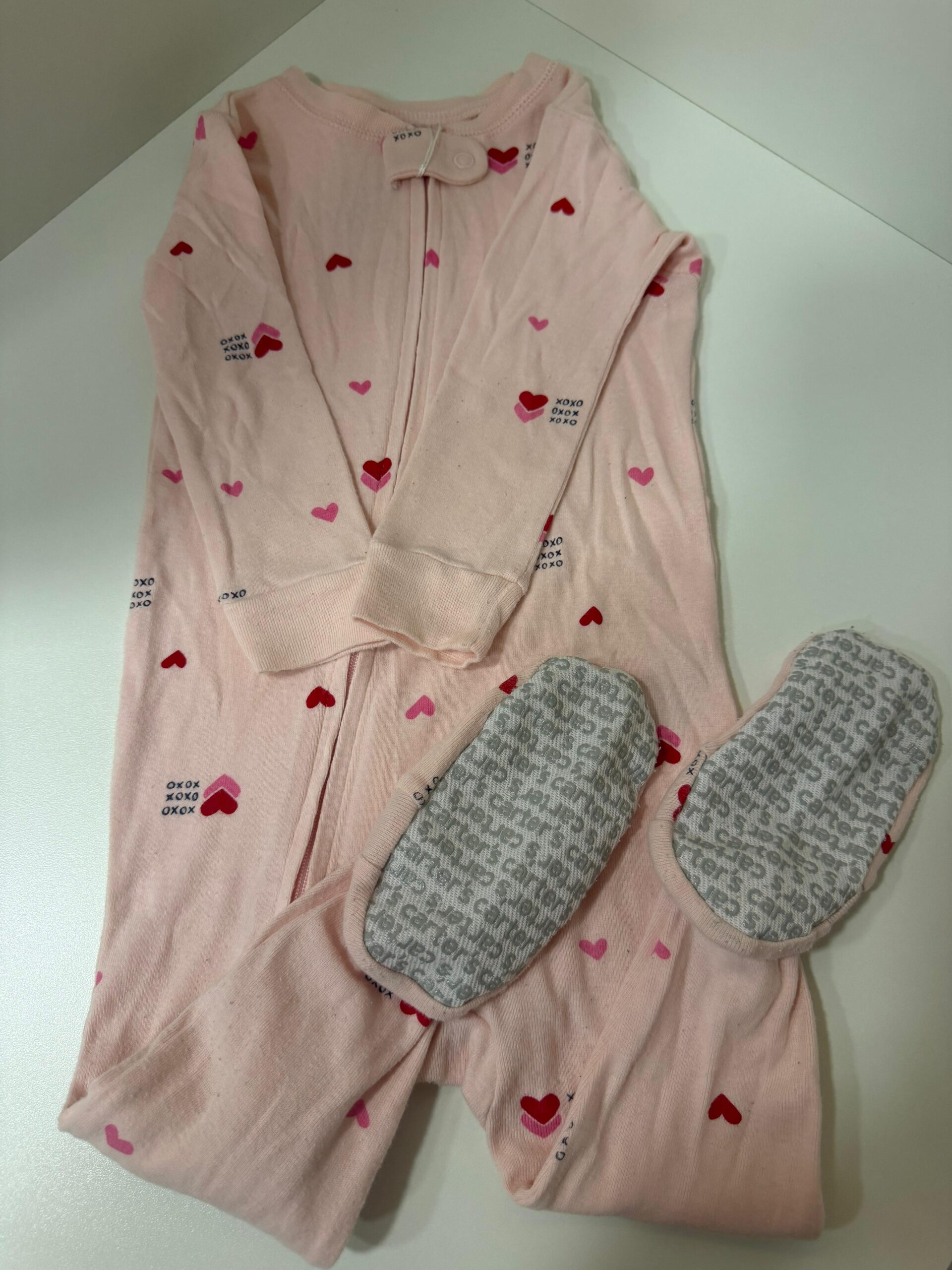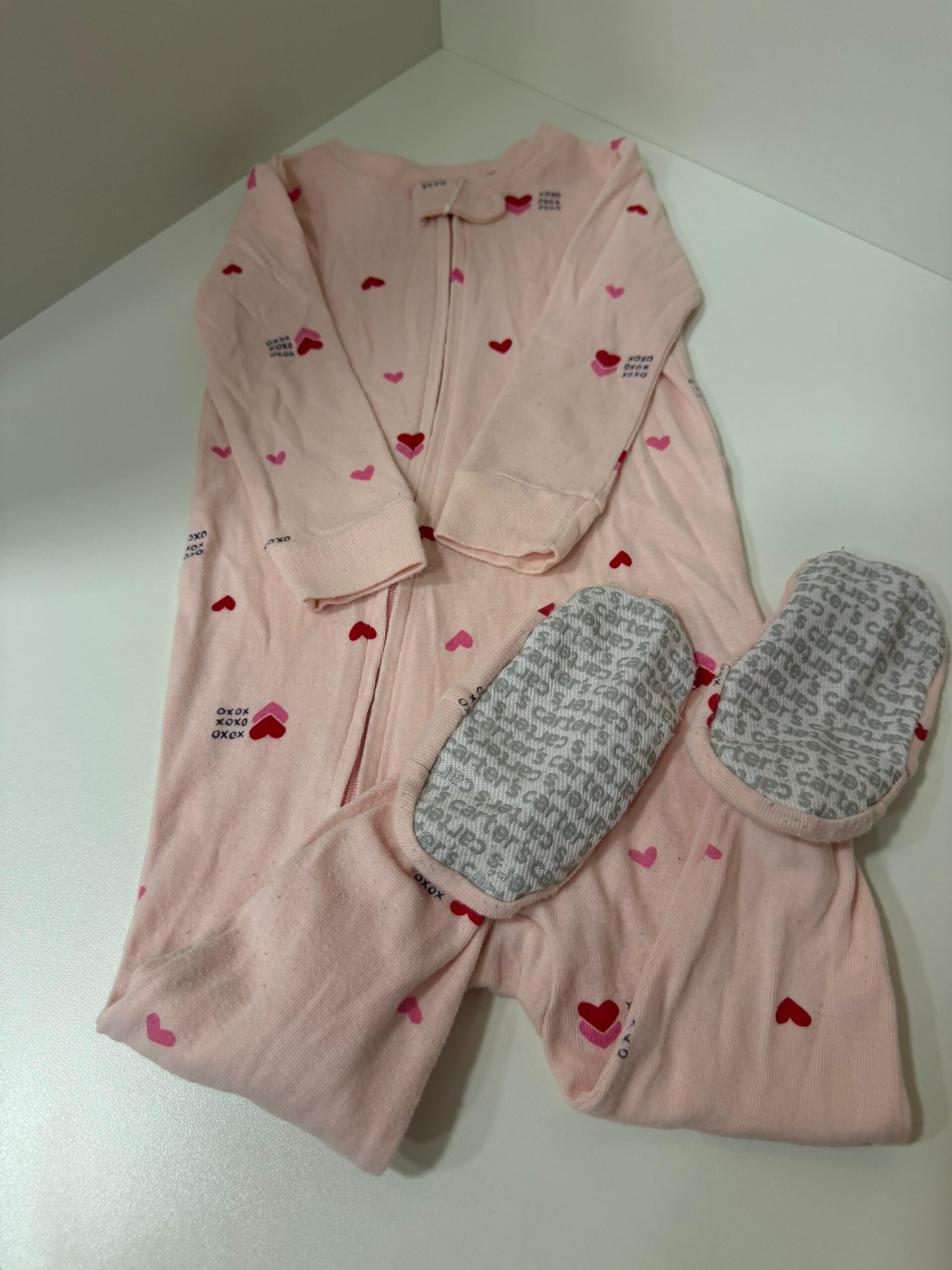 Macacão estilo pijama em tom rosa claro com estampa delicada de corações e detalhes em “xoxo”, trazendo um toque fofo e divertido à peça.