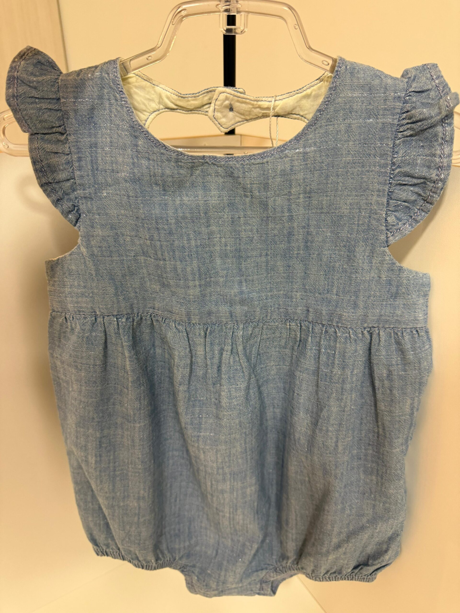 Confeccionado em jeans leve, a peça tem mangas com babadinhos que dão um toque romântico ao visual.