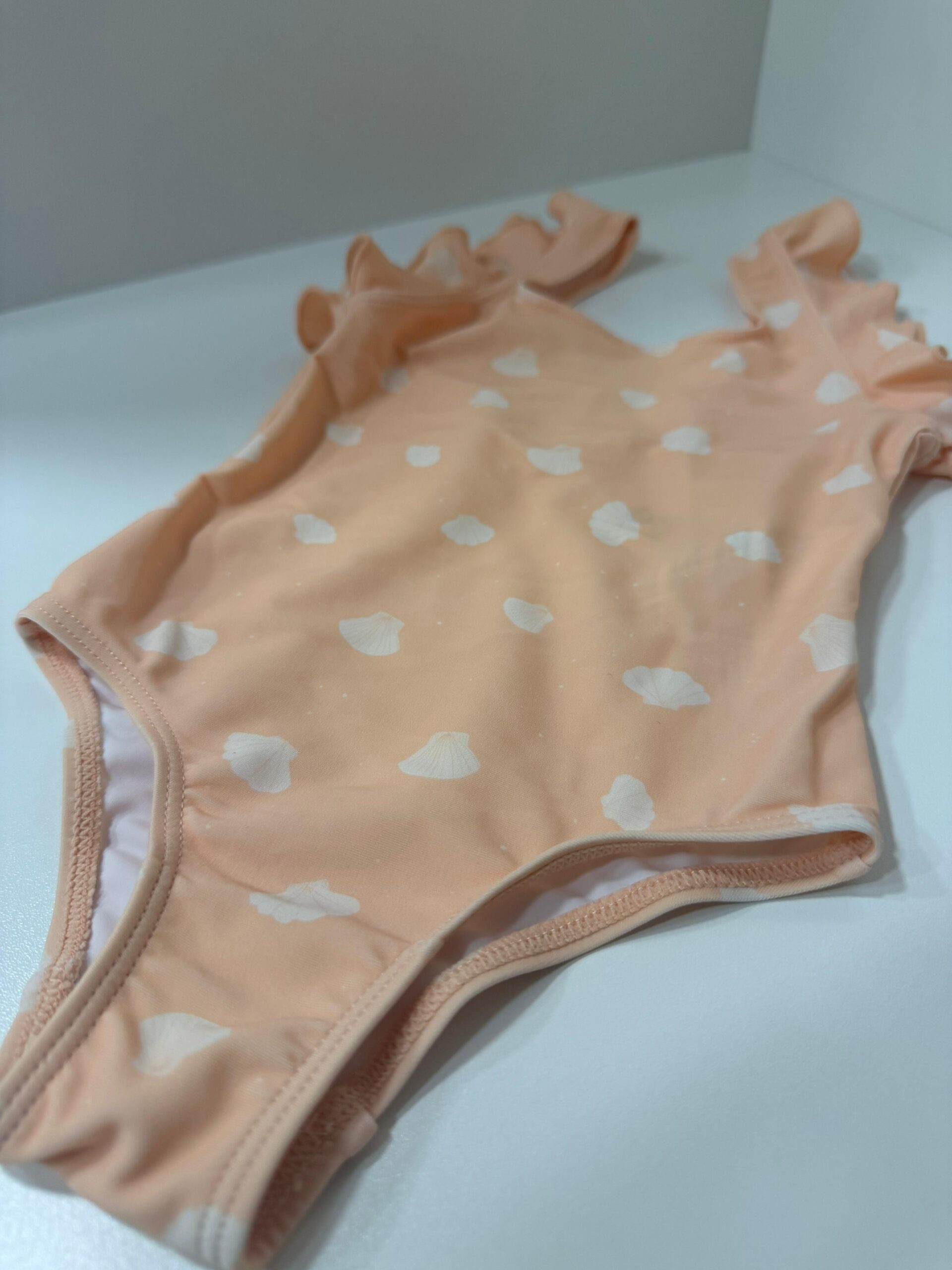 Maiô infantil em tom pêssego suave, com delicada estampa de conchas brancas que traz um ar praiano e encantador à peça.