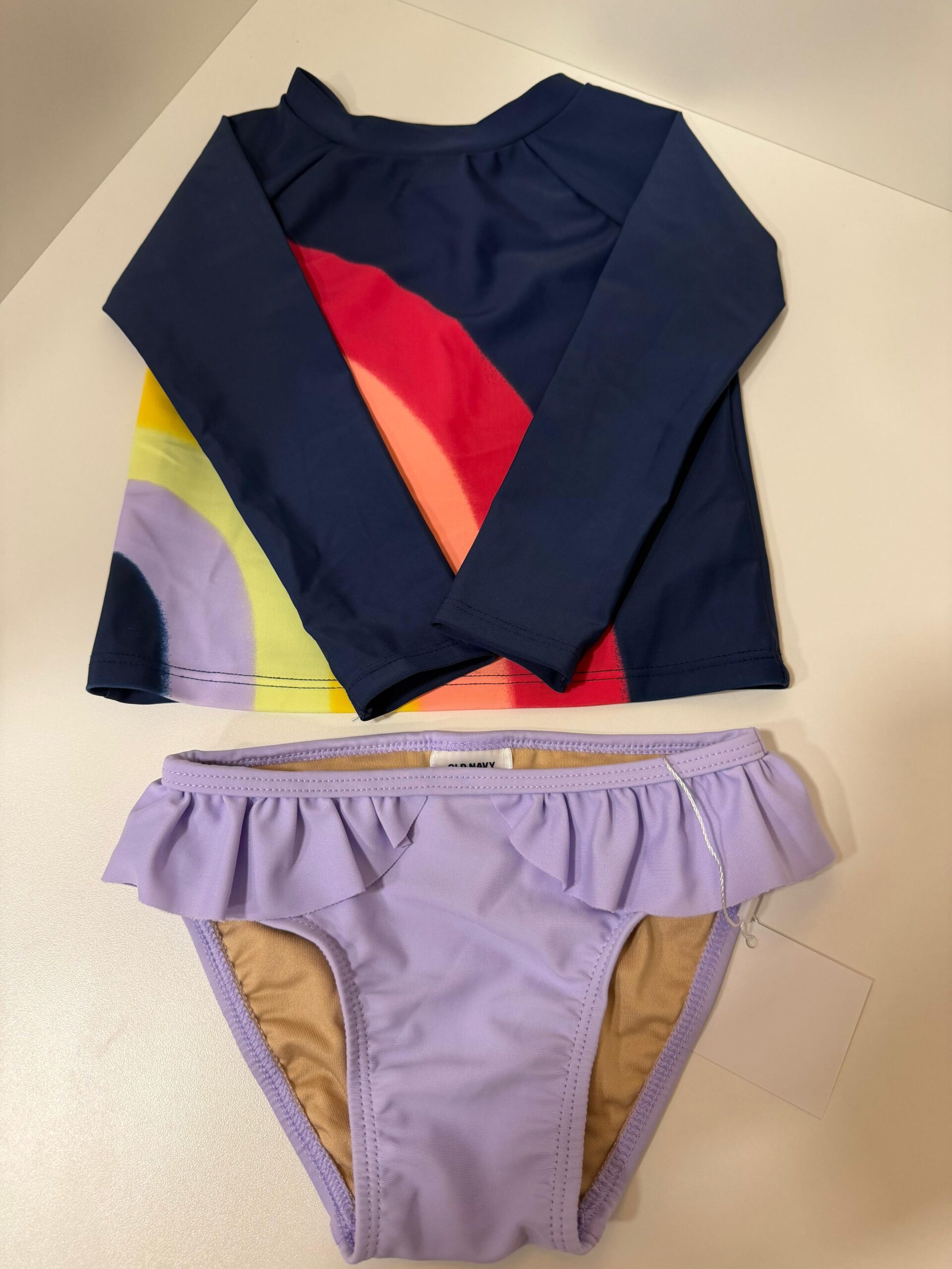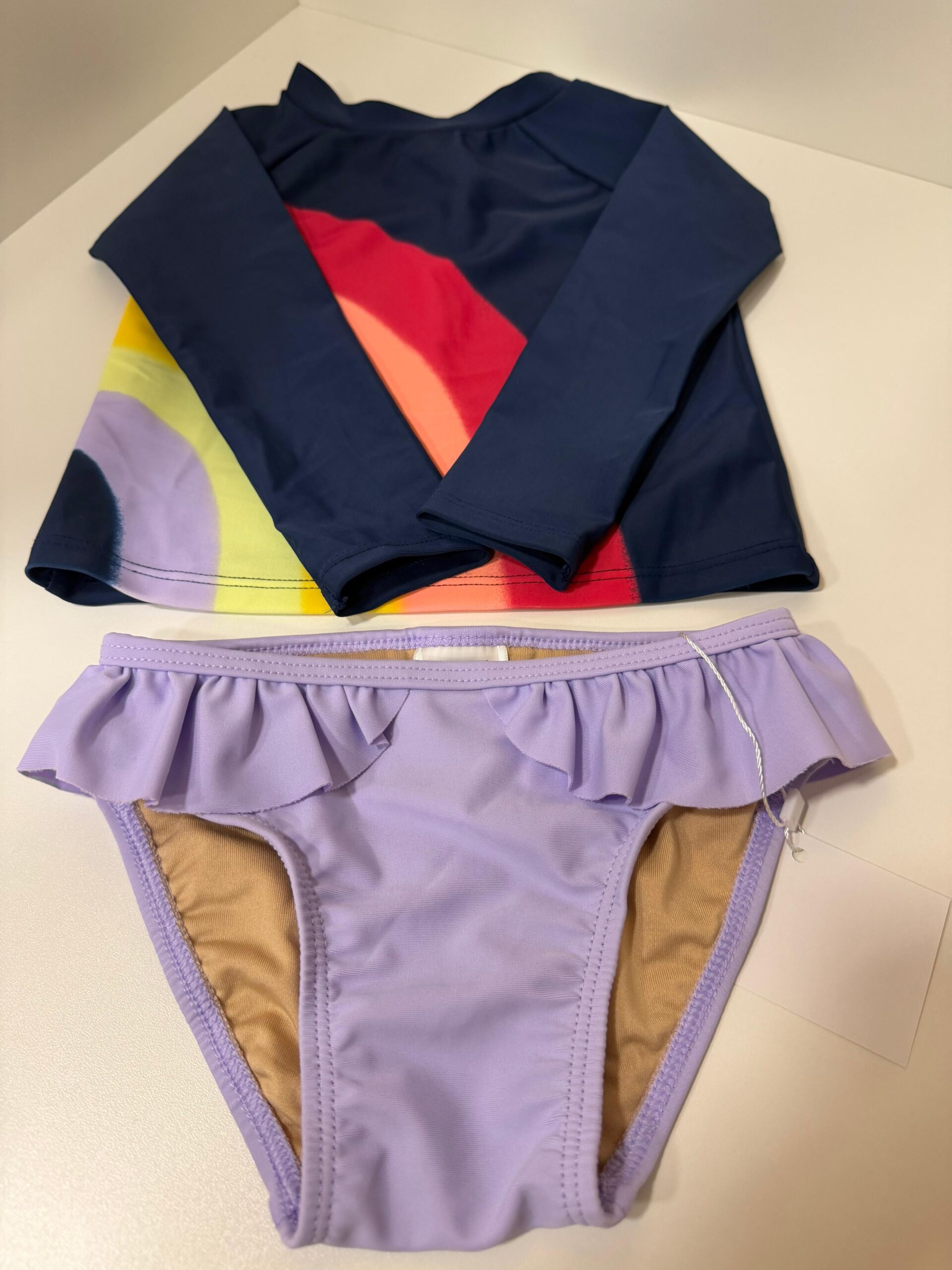 Maio infantil composto por top manga longa em azul-marinho com estampa moderna e colorida, e calcinha em lilás com delicado babado na cintura. Um conjunto estiloso e funcional, perfeito para os dias de praia e piscina.