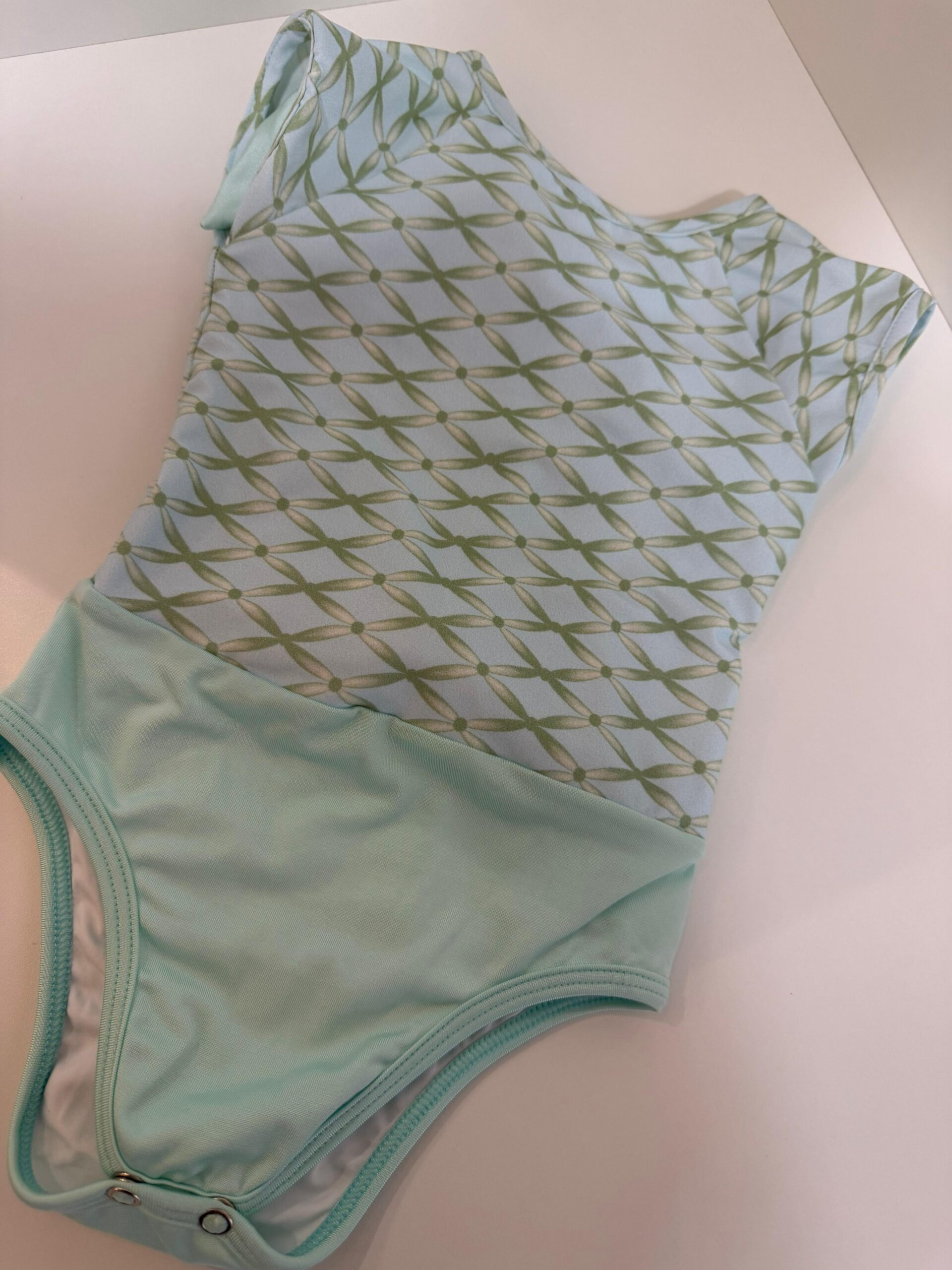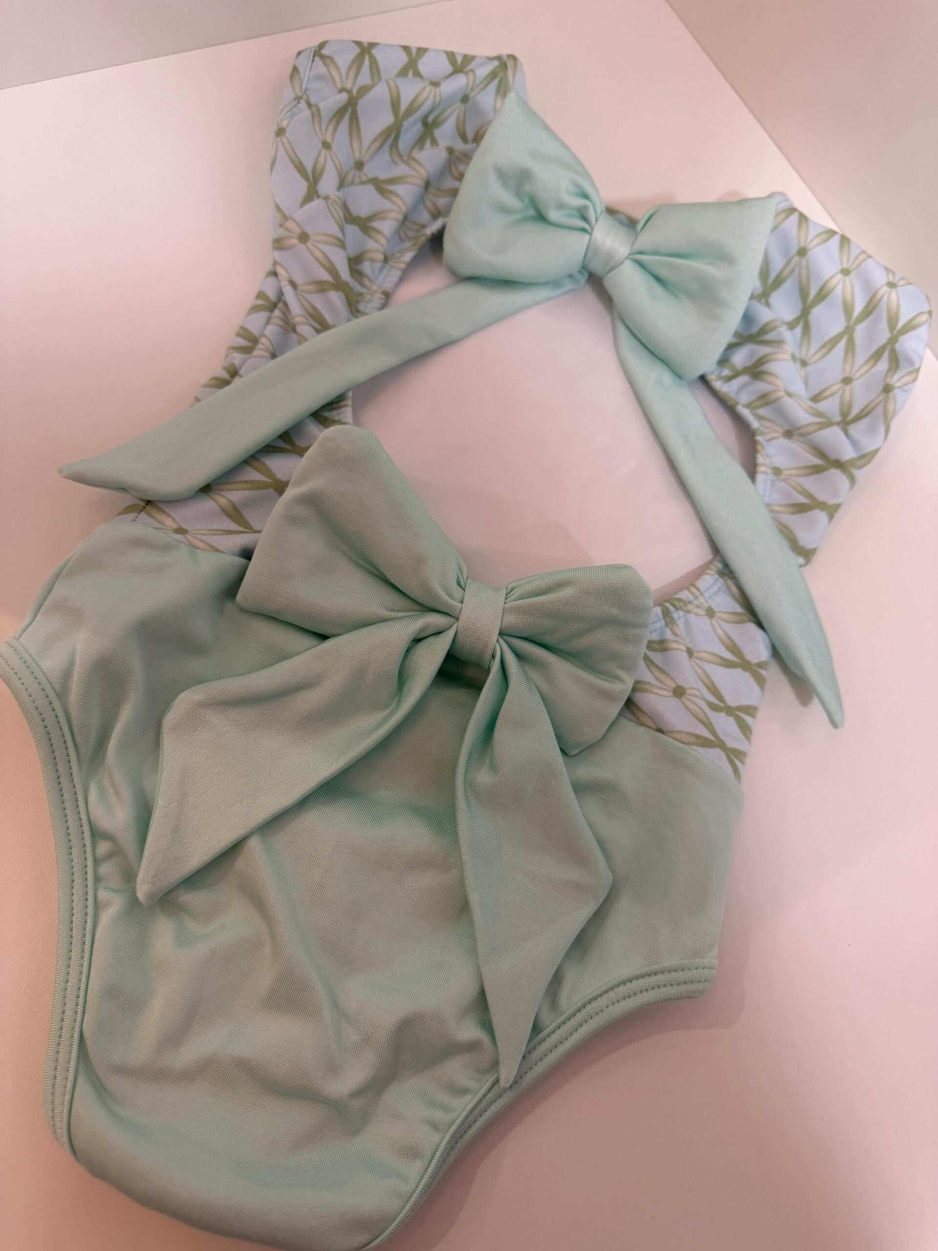 Maiô infantil em tom verde água suave, com design moderno que combina parte lisa com estampa geométrica delicada em tons de verde e azul claro. Possui modelagem confortável e fechamento inferior por botões de pressão, facilitando a troca. O destaque fica por conta do laço posterior em faixa larga, que traz charme e elegância à peça. Ideal para praia, piscina ou passeios de verão com muito estilo.