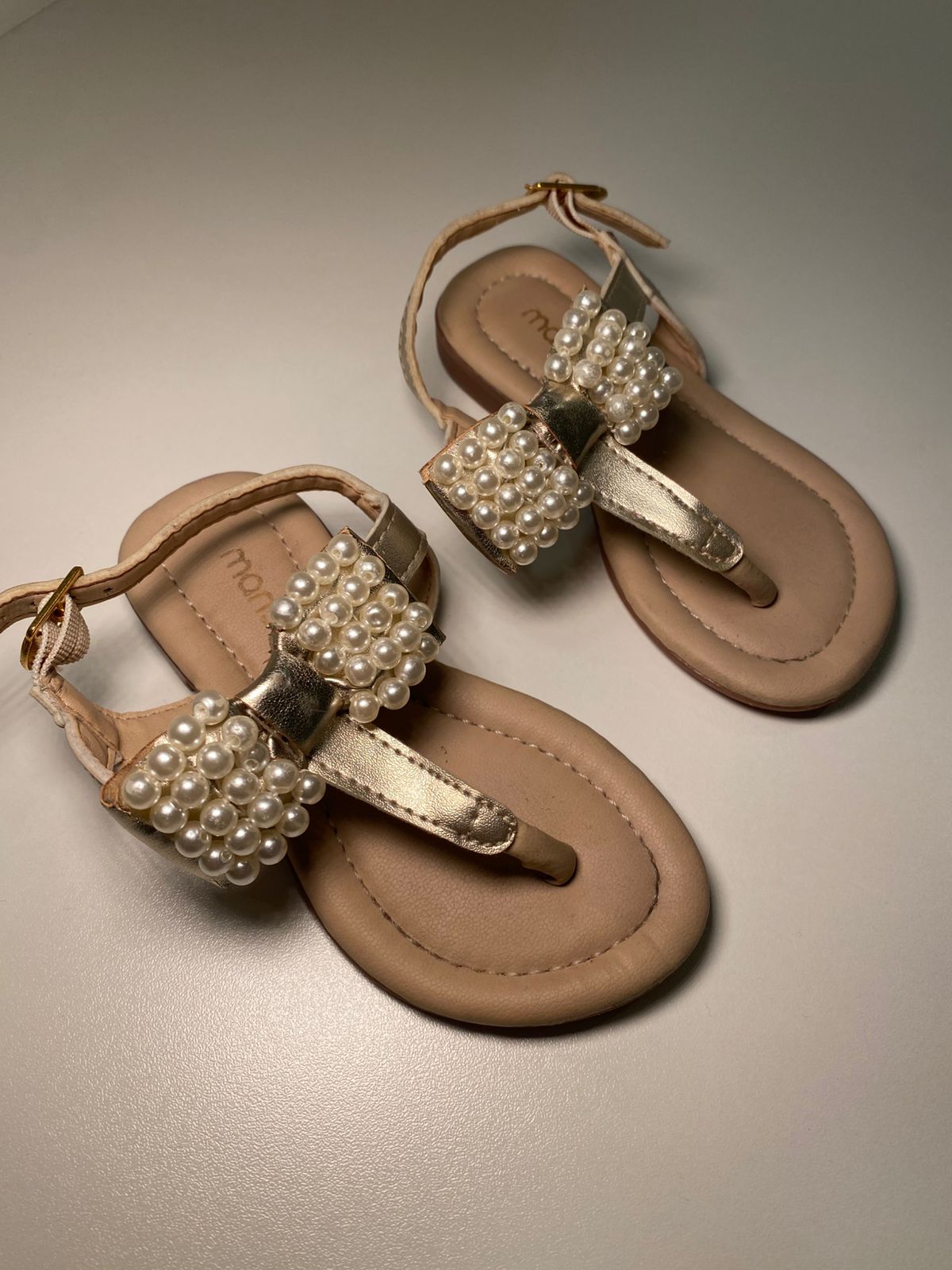Sandália em tom dourado com acabamento delicado e fechamento no tornozelo, garantindo segurança e conforto.