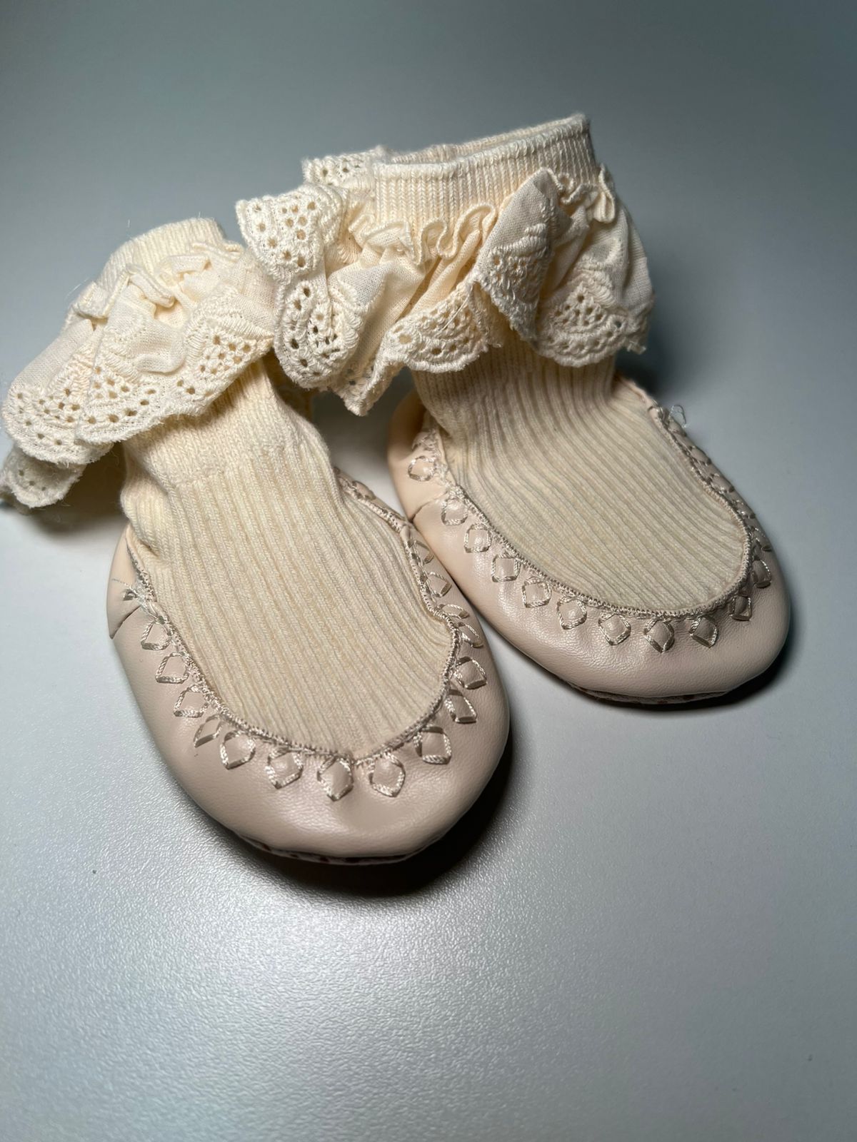 Sapatilha em tom neutro com acabamento delicado e detalhe bordado, acompanhada de meia canelada com babado em renda super charmosa.