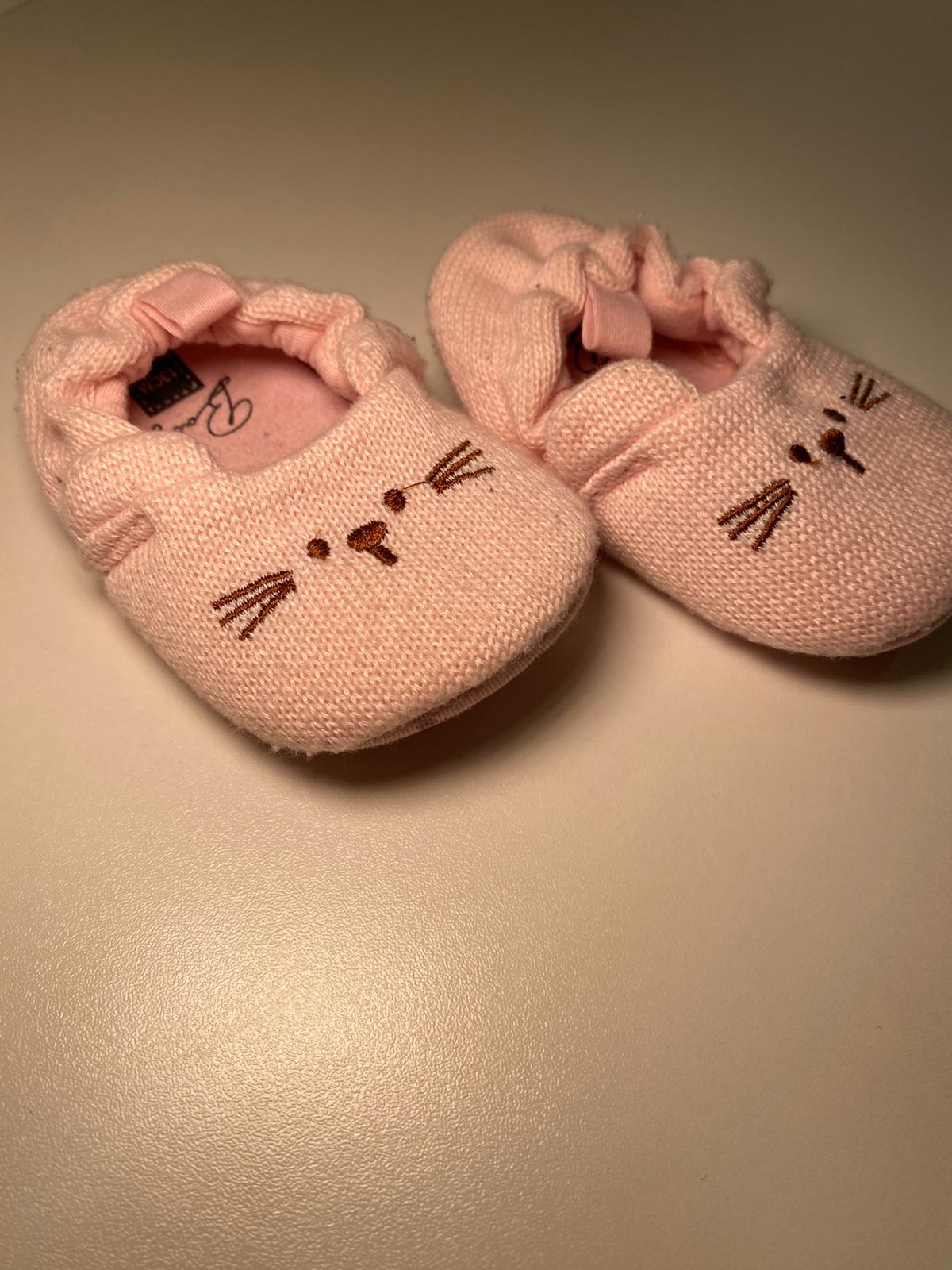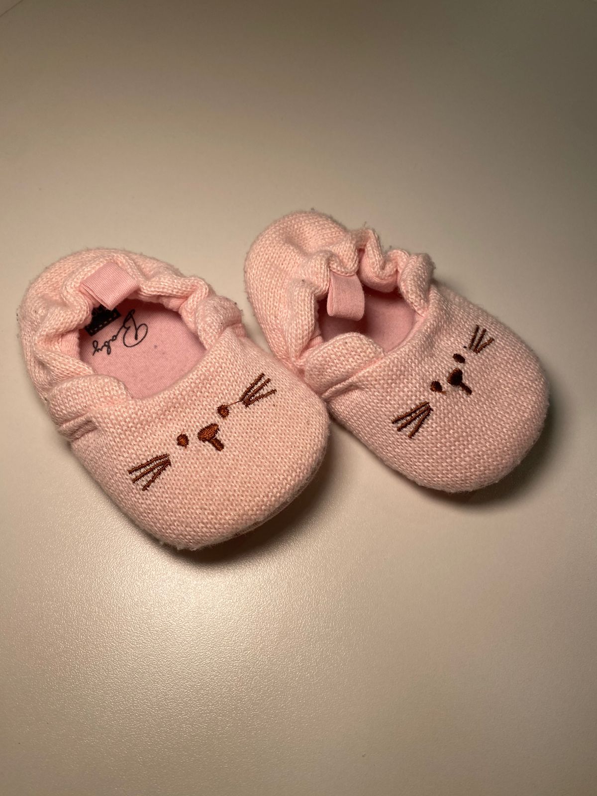 Um charme só! Esse sapatinho em tricô na cor rosa claro traz um delicado rostinho de gatinho bordado, deixando o look ainda mais fofo e especial.