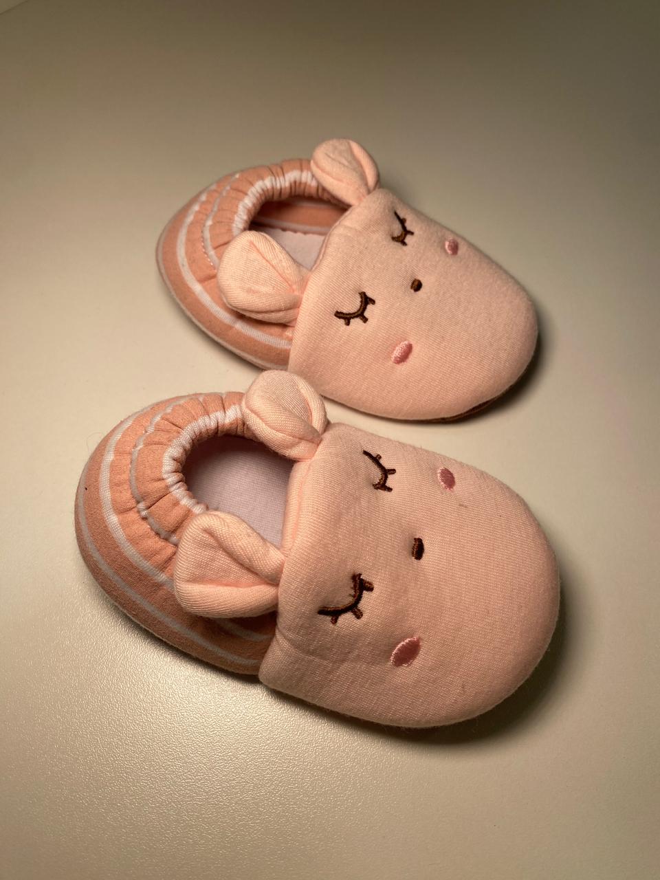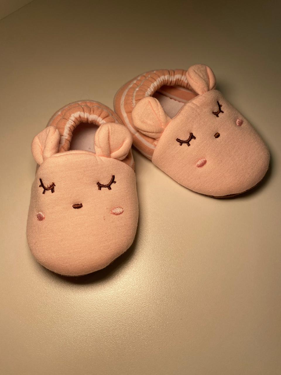 Sapatinho macio e confortável em tom rosé, com aplicação de ursinho delicado e detalhes bordados super fofos.