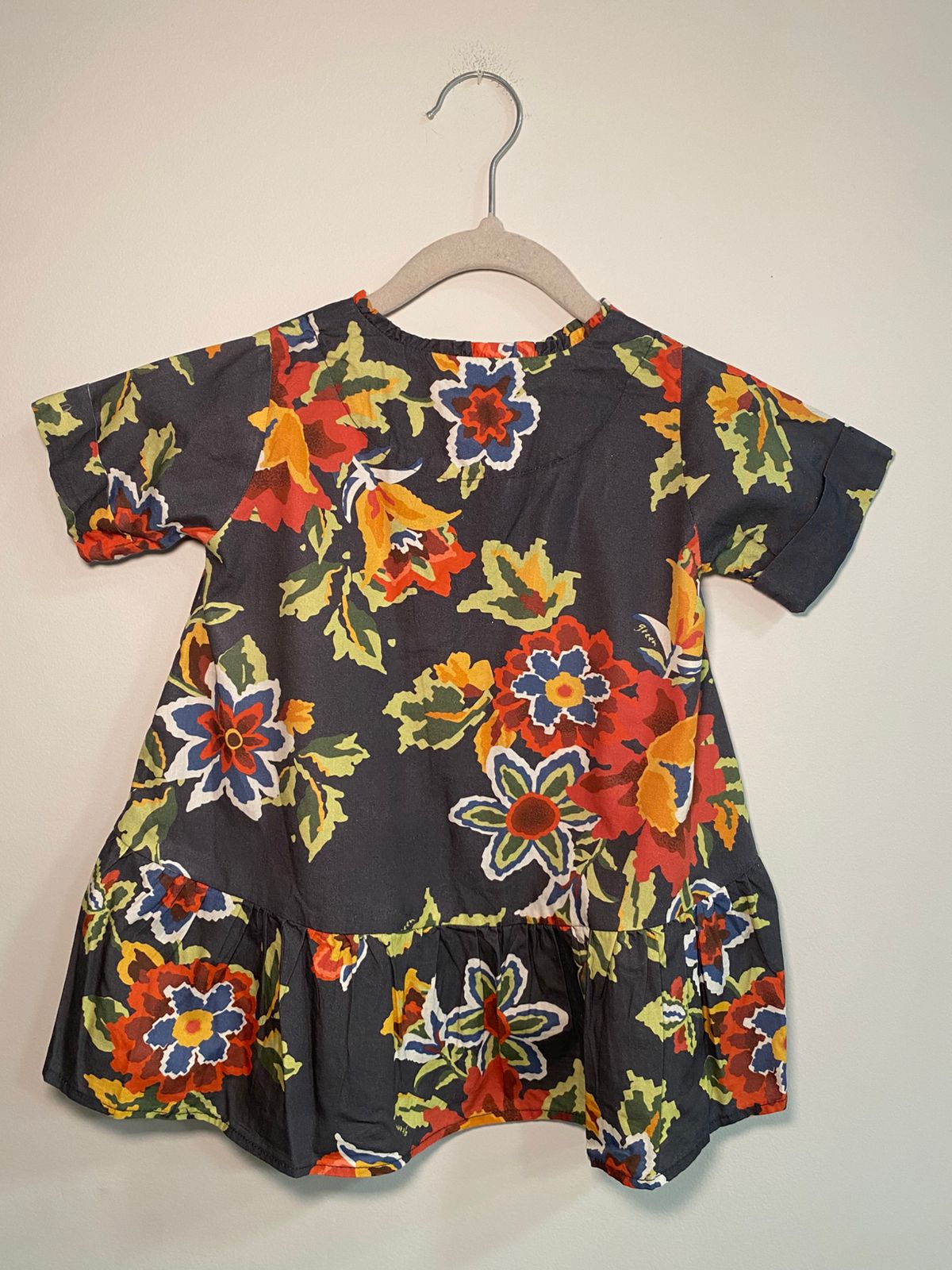 O vestido traz uma estampa floral vibrante sobre fundo escuro, criando um contraste moderno e encantador.