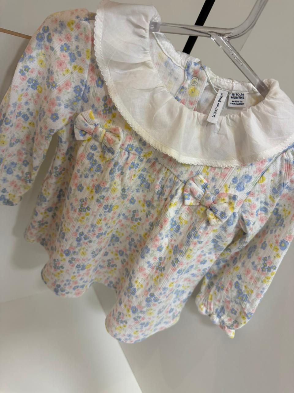 A peça tem estampa floral suave em tons pastel, com uma linda gola branca que traz um toque elegante e atemporal.