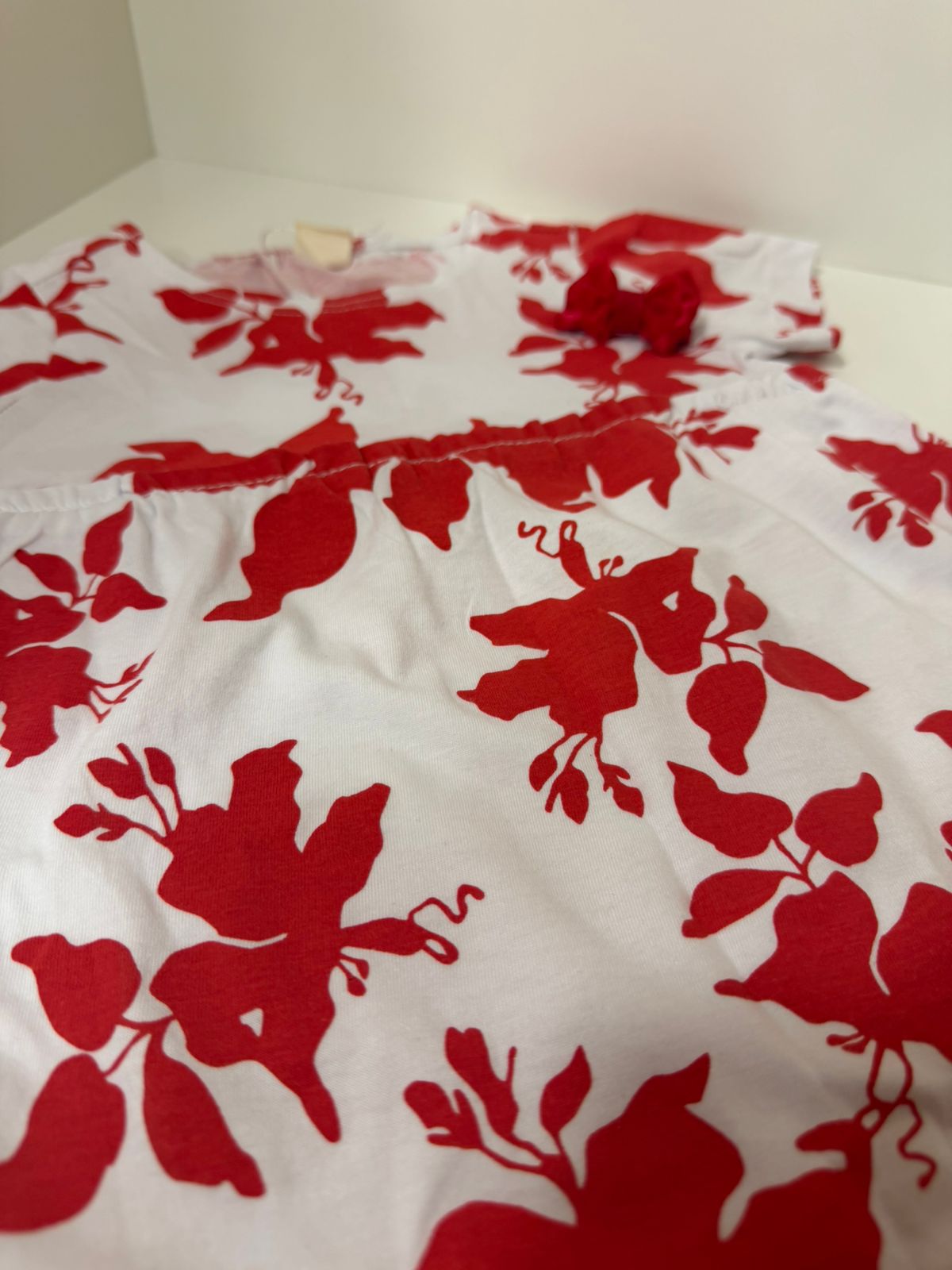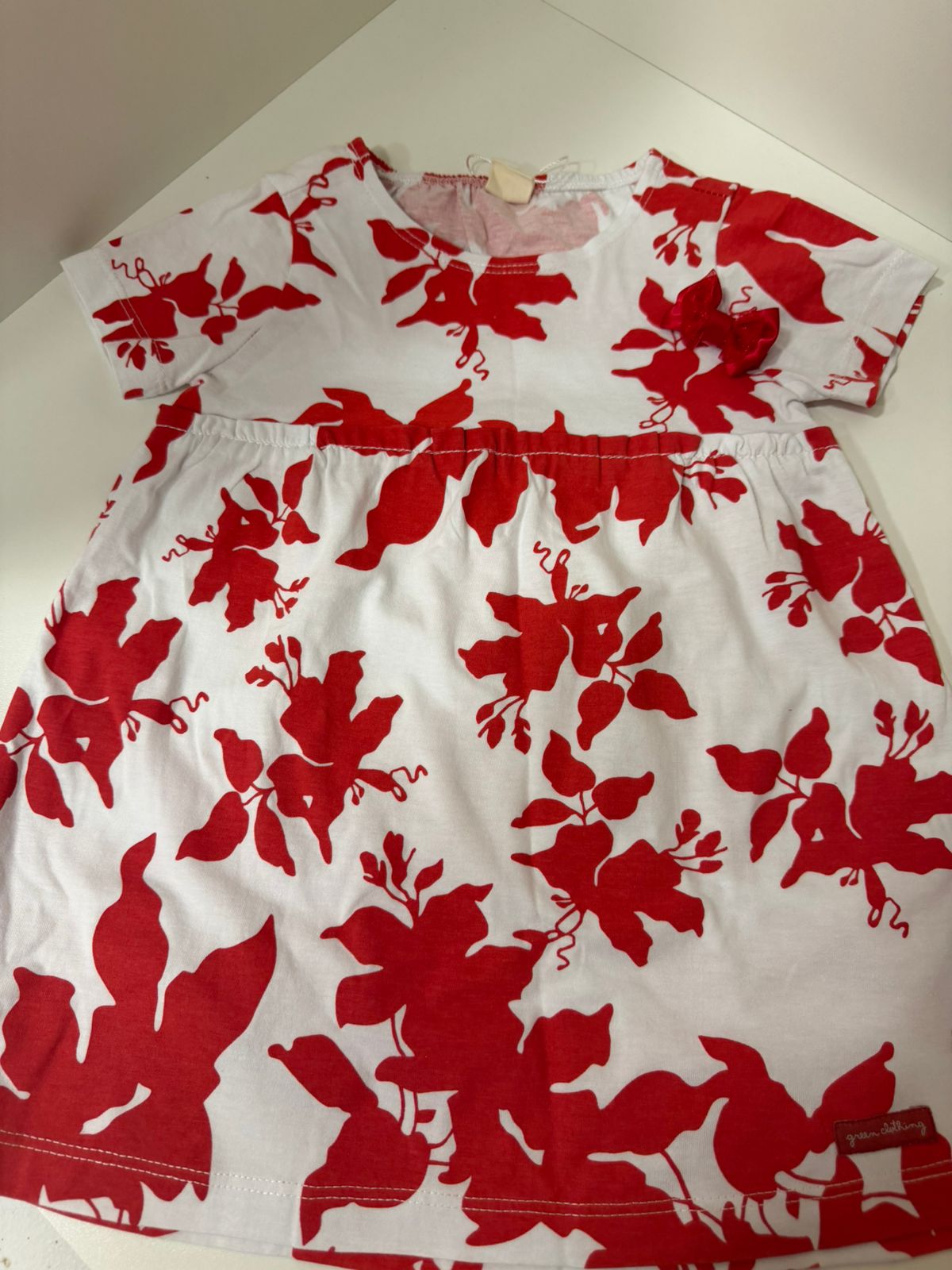 A modelagem soltinha com saia franzida traz movimento e charme, enquanto o conjunto acompanha tapa-fralda no mesmo tecido, garantindo um acabamento impecável ao look.